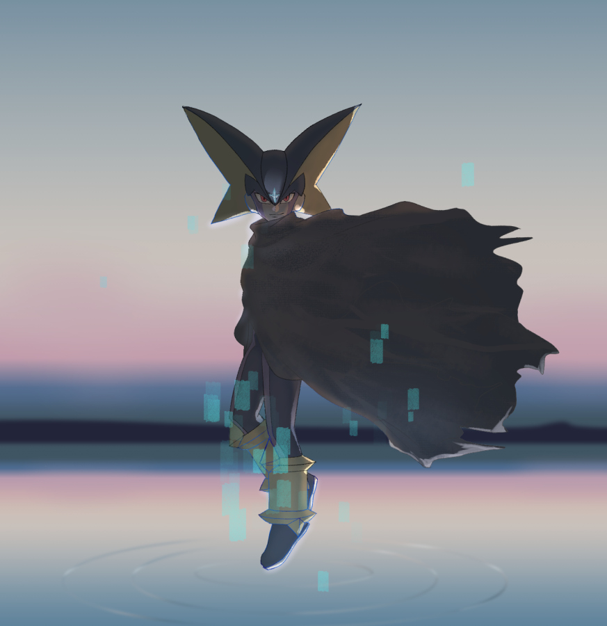 1boy bass.exe_(mega_man) black_helmet brown_cloak cloak facial_mark fins forehead_jewel full_body head_fins helmet looking_at_viewer male_focus mega_man_(series) mega_man_battle_network_(series) netnavi red_eyes solo tumitumi