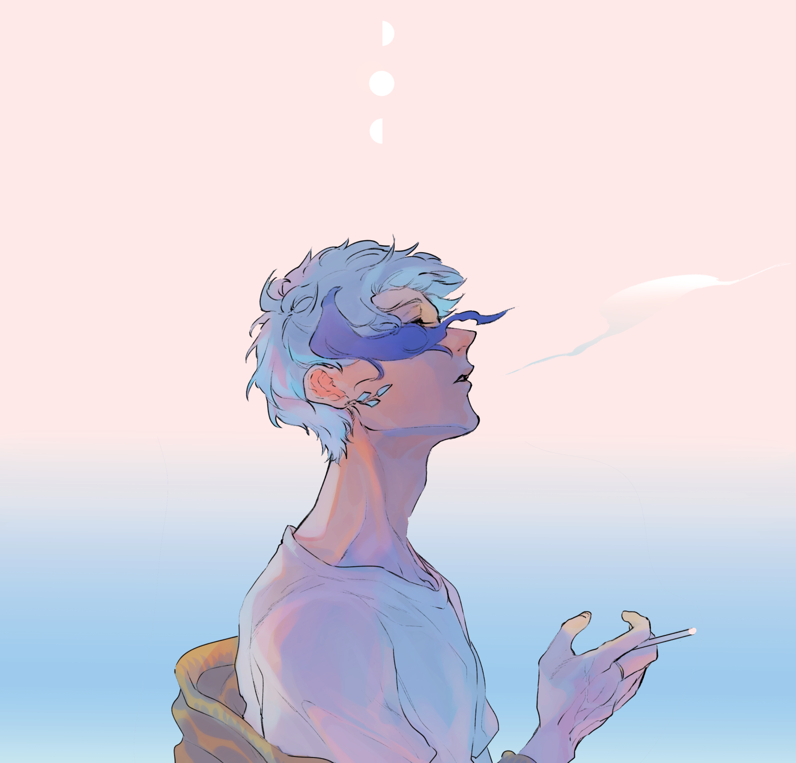 1boy akiharu_(nanjaaaaa) blue_hair earrings floyd_leech golden_hour highres jewelry multicolored_hair shirt single_earring smoking solo streaked_hair twisted_wonderland white_shirt