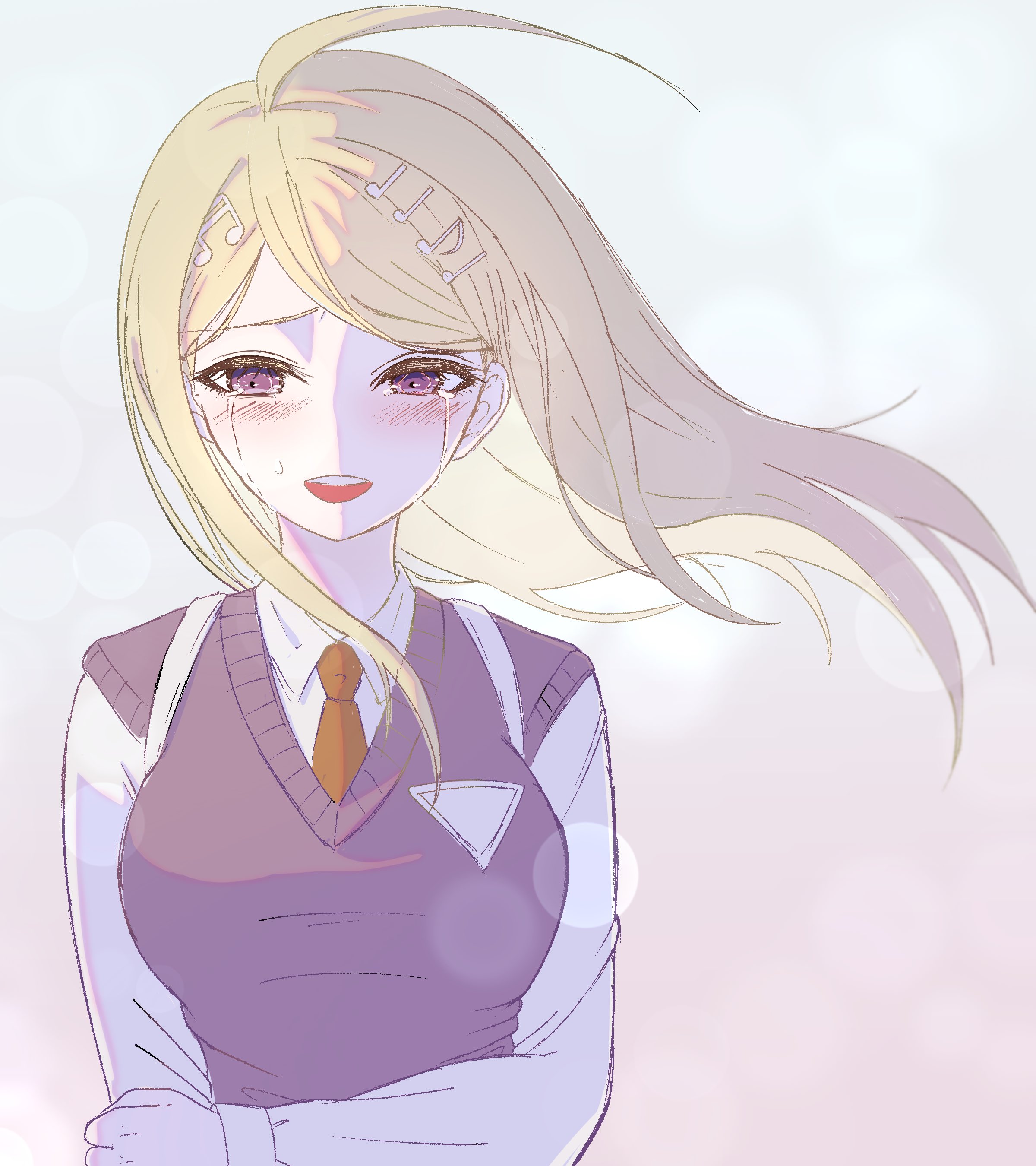 1girl :d absurdres ahoge akamatsu_kaede blush breasts collared_shirt danganronpa_(series) danganronpa_v3:_killing_harmony fortissimo grey_background hair_ornament highres large_breasts long_hair mion_danron musical_note musical_note_hair_ornament necktie open_mouth orange_necktie pink_eyes pink_sweater_vest shirt simple_background smile solo sweater_vest teeth upper_body upper_teeth_only white_shirt