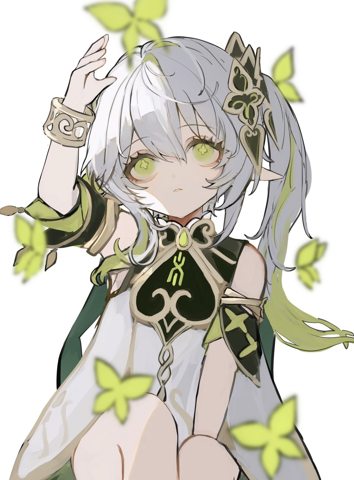 1girl arm_up bug butterfly cowboy_shot expressionless genshin_impact green_butterfly green_eyes hair_between_eyes hair_ornament highres insect looking_up nahida_(genshin_impact) parted_lips pointy_ears ponytail side_ponytail sidelocks simple_background sitting solo toke_ino white_background