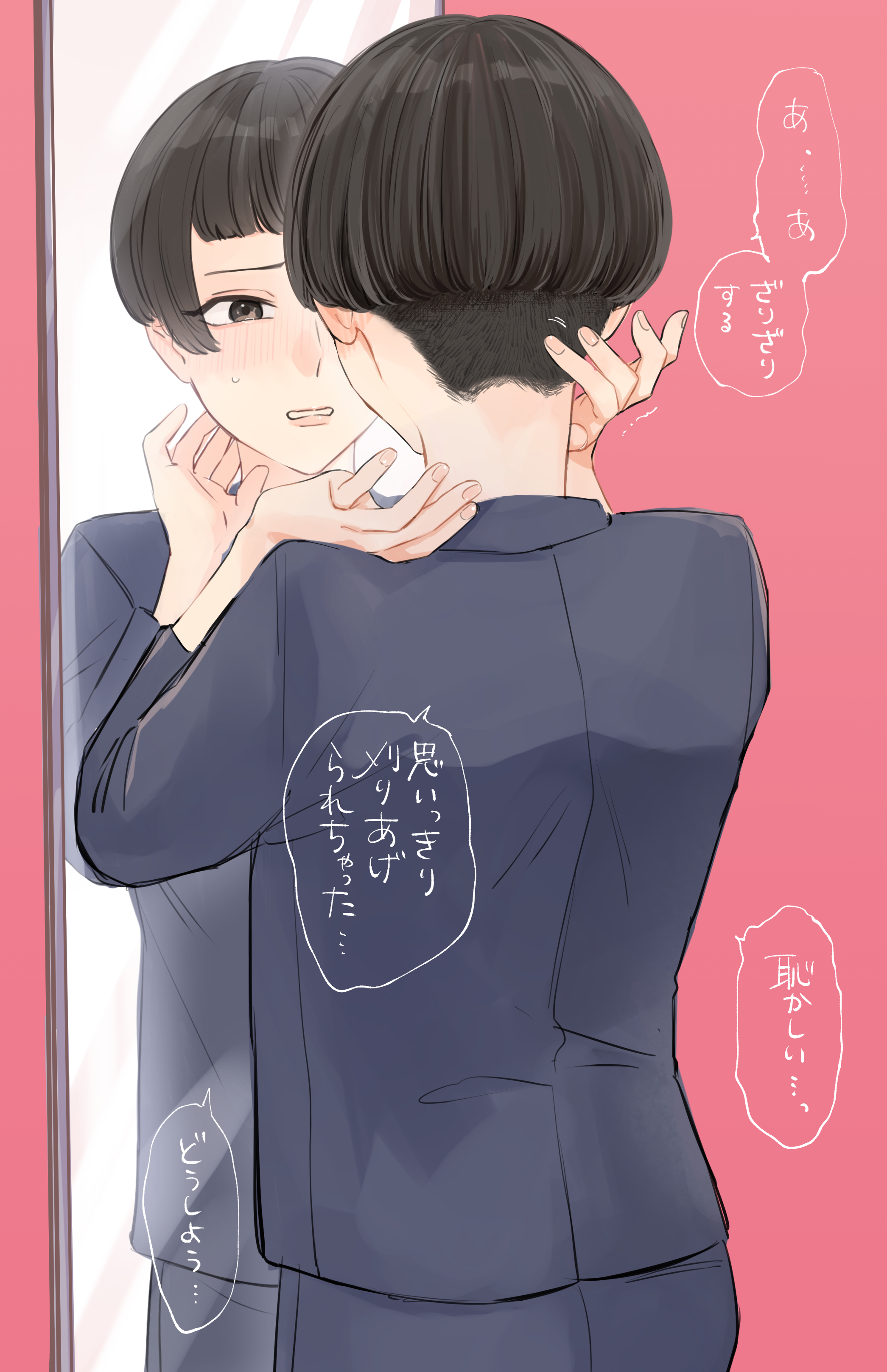 1girl absurdres black_eyes black_hair black_pants black_shirt blunt_bangs blush bob_cut collared_shirt cowboy_shot embarrassed from_behind hands_up highres kyoi_hey looking_at_mirror looking_at_self mirror motion_lines neck original pants pink_background pink_lips pink_nails raised_eyebrows shirt short_hair simple_background solo speech_bubble sweat talking undercut
