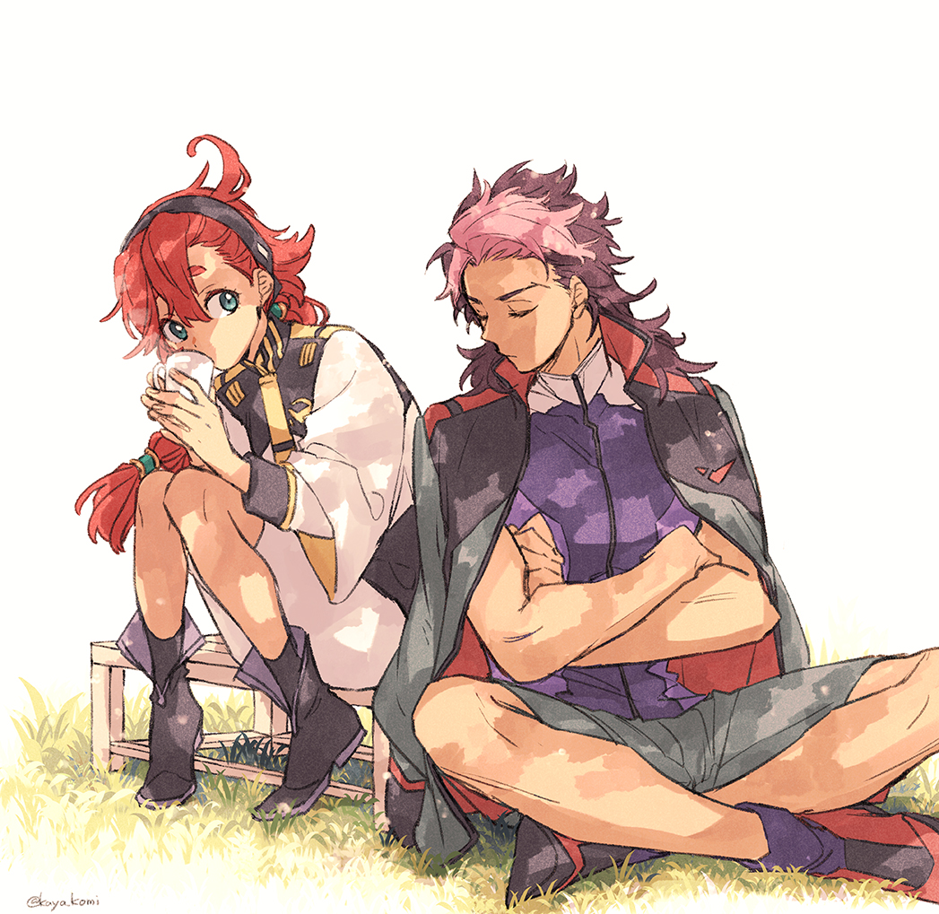 1boy 1girl asticassia_school_uniform black_hairband brown_hair closed_eyes crossed_arms cup full_body green_eyes grey_jacket grey_shorts guel_jeturk gundam gundam_suisei_no_majo hair_between_eyes hairband holding holding_cup jacket jacket_on_shoulders long_hair low_ponytail multicolored_hair pink_hair ponytail red_hair school_uniform shorts simple_background sitting suletta_mercury two-tone_hair wakaya_hana white_background white_jacket white_shorts