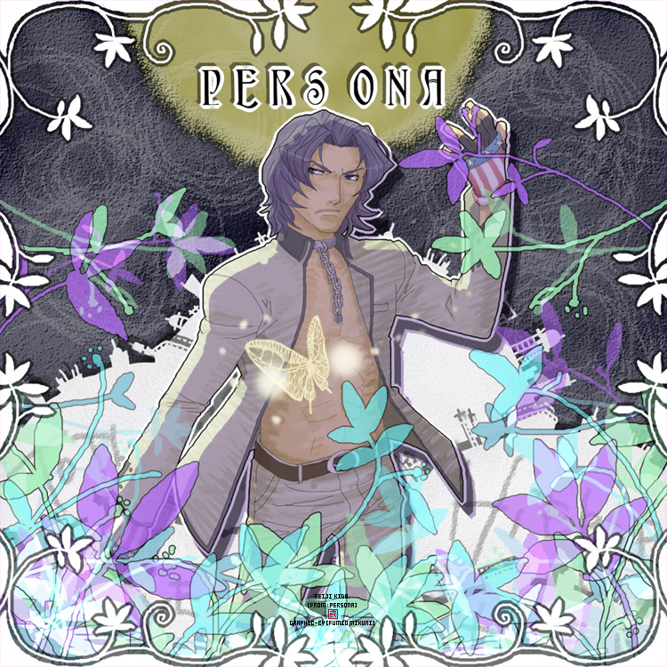 1boy abs american_flag american_flag_gloves american_flag_print belt black_hair blazer brown_belt bug butterfly chain chain_around_neck copyright_name fingerless_gloves flag_print frown fumio_mikuni gloves grey_jacket grey_pants insect jacket kido_reiji looking_to_the_side male_focus pants persona persona_1 print_gloves school_uniform solo st._hermelin_school_uniform