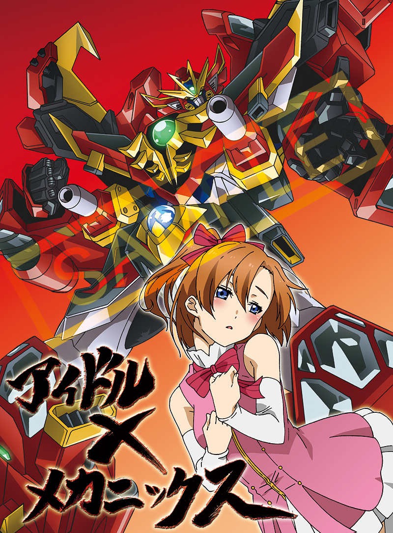 1girl arm_cannon blue_eyes brown_hair choujuushin_gravion_zwei clenched_hand crossover dual_arm_cannons glowing glowing_eyes matatabeat mecha robot science_fiction super_robot uchuu_taitei_god_sigma ultimate_gravion weapon wrist_blades