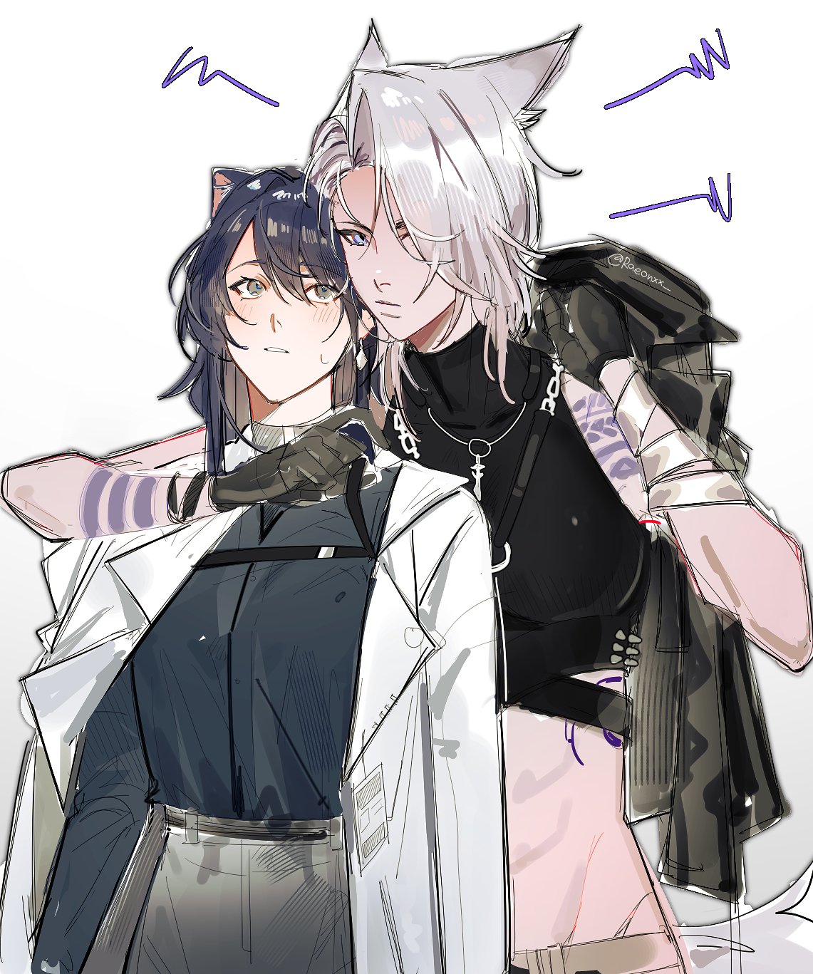 2girls 3o_c animal_ears arm_around_neck black_gloves black_hair black_shirt blush cat_ears chest_harness chief_(path_to_nowhere) coat coat_on_shoulders commentary crop_top earrings english_commentary female_chief_(path_to_nowhere) gloves grey_eyes grey_hair grey_pants harness highres jewelry kemonomimi_mode long_hair looking_at_viewer multiple_girls pants parted_lips path_to_nowhere shirt simple_background sweatdrop toned toned_female white_background white_coat yuri zoya_(path_to_nowhere)