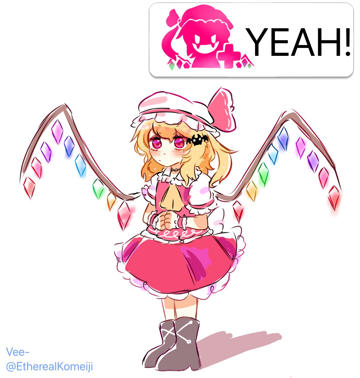1girl ascot blonde_hair blush crystal_wings english_text etherealkomeiji flandre_scarlet frills hat highres meme miiverse_yeah!_(meme) mob_cap red_eyes simple_background solo touhou white_background white_hat wings wrist_cuffs yellow_ascot