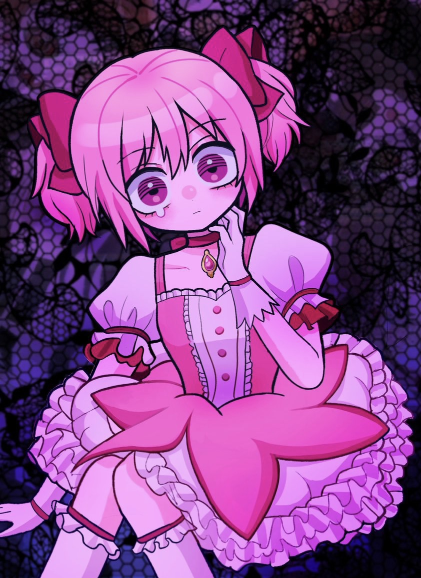 1girl gloves kaname_madoka kaname_madoka_(magical_girl) keropiki looking_at_viewer mahou_shoujo_madoka_magica pink_eyes pink_hair short_twintails solo tearing_up twintails white_gloves
