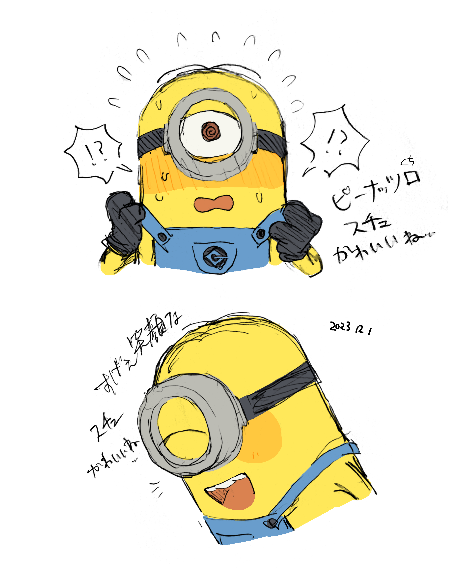 !? ake_blood black_gloves blue_overalls blush brown_eyes closed_eyes colored_skin despicable_me flying_sweatdrops gloves goggles highres minion_(despicable_me) minions_(movie) no_humans one-eyed overalls short_hair speech_bubble translation_request yellow_skin