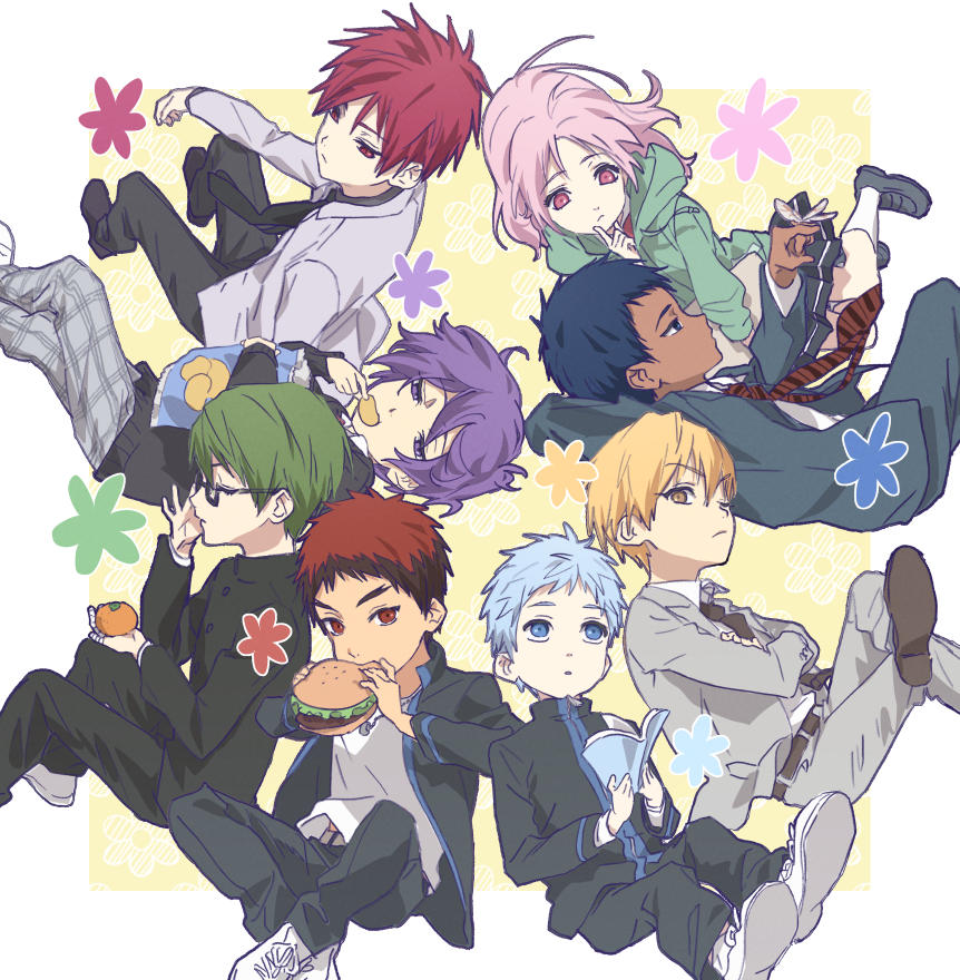 1girl 6+boys adjusting_eyewear akashi_seijuurou aomine_daiki bag_of_chips belt black_belt black_footwear black_jacket black_necktie black_pants blonde_hair blue_hair book border brown_necktie burger chips_(food) closed_eyes eating flower food formal_clothes fruit glasses green_hair green_hoodie grey_suit holding holding_book hood hoodie jacket kagami_taiga kise_ryouta kuroko_no_basuke kuroko_tetsuya midorima_shintarou momoi_satsuki multiple_boys murasakibara_atsushi necktie one_eye_closed orange_(fruit) outside_border pants pink_eyes pink_hair purple_eyes purple_hair red_eyes red_hair school_uniform shoes short_hair sneakers suit tt_am618 two-tone_necktie white_border white_footwear yellow_eyes