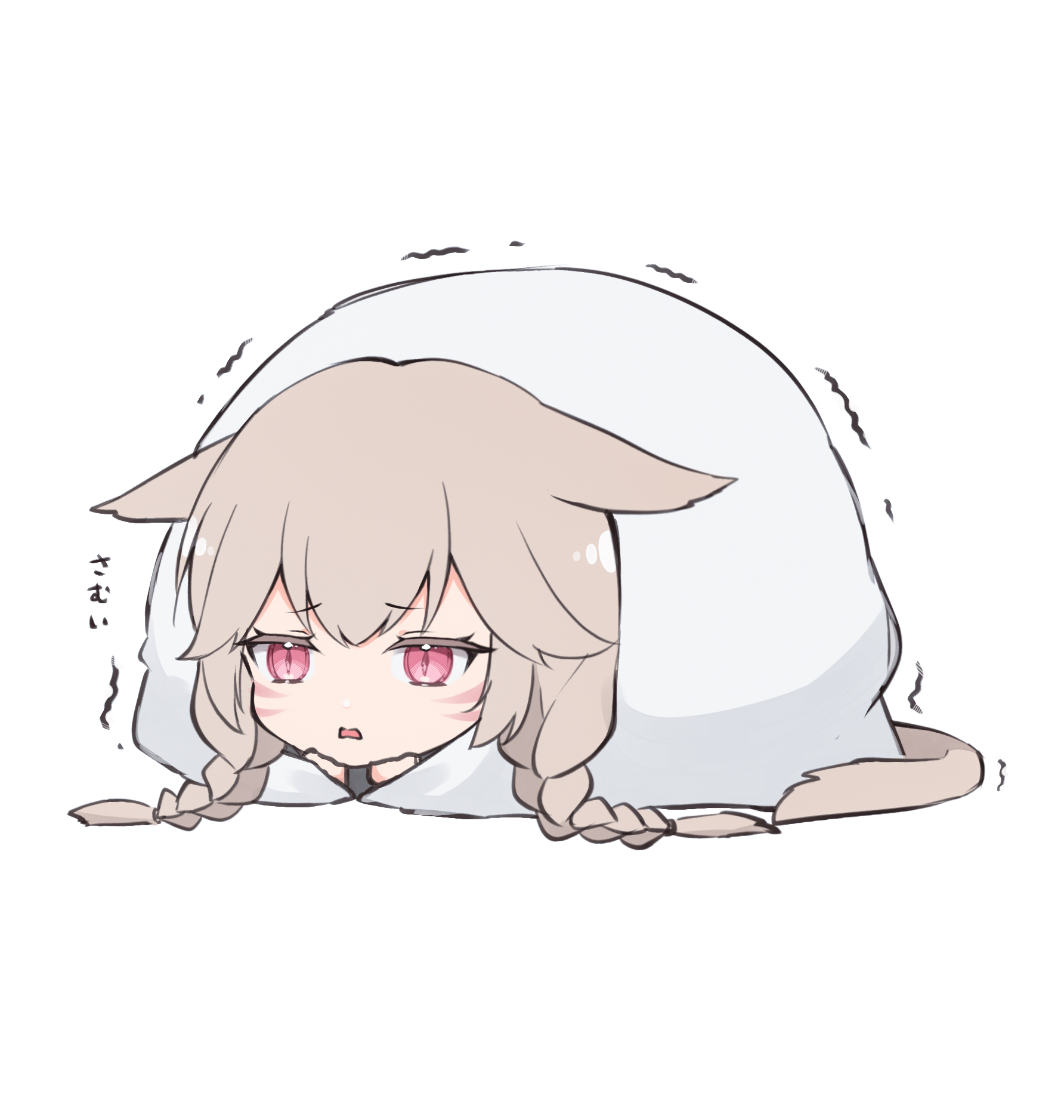 1girl animal_ears blanket braid cat_ears cat_girl cat_tail chibi cold doodle facial_mark final_fantasy final_fantasy_xiv highres light_brown_hair miqo'te sana_(sanamaru_0w0) solo tail trembling twin_braids under_covers warrior_of_light_(ff14) whisker_markings