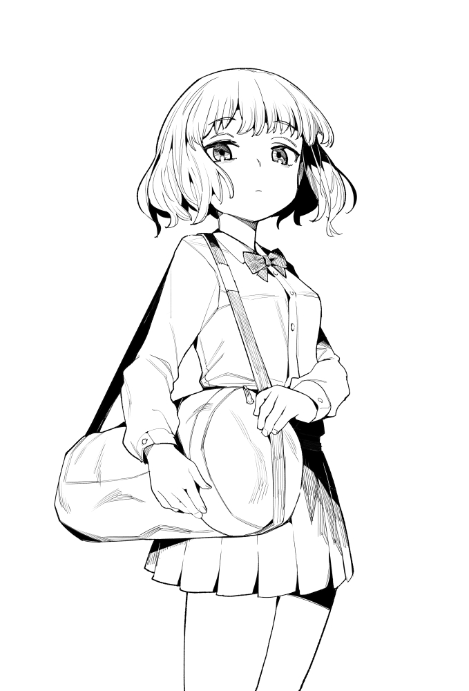 1girl backpack bag bow bowtie breasts collared_shirt commentary_request expressionless greyscale henry_bird_9 looking_at_viewer monochrome original pleated_skirt shirt short_hair simple_background skirt small_breasts solo