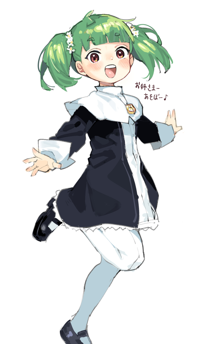 1girl black_dress brown_eyes commentary_request dress flower green_hair hair_flower hair_ornament henry_bird_9 highres jewelry looking_at_viewer necklace open_mouth original outstretched_arms pantyhose simple_background sketch smile solo spread_arms translated twintails white_background white_pantyhose