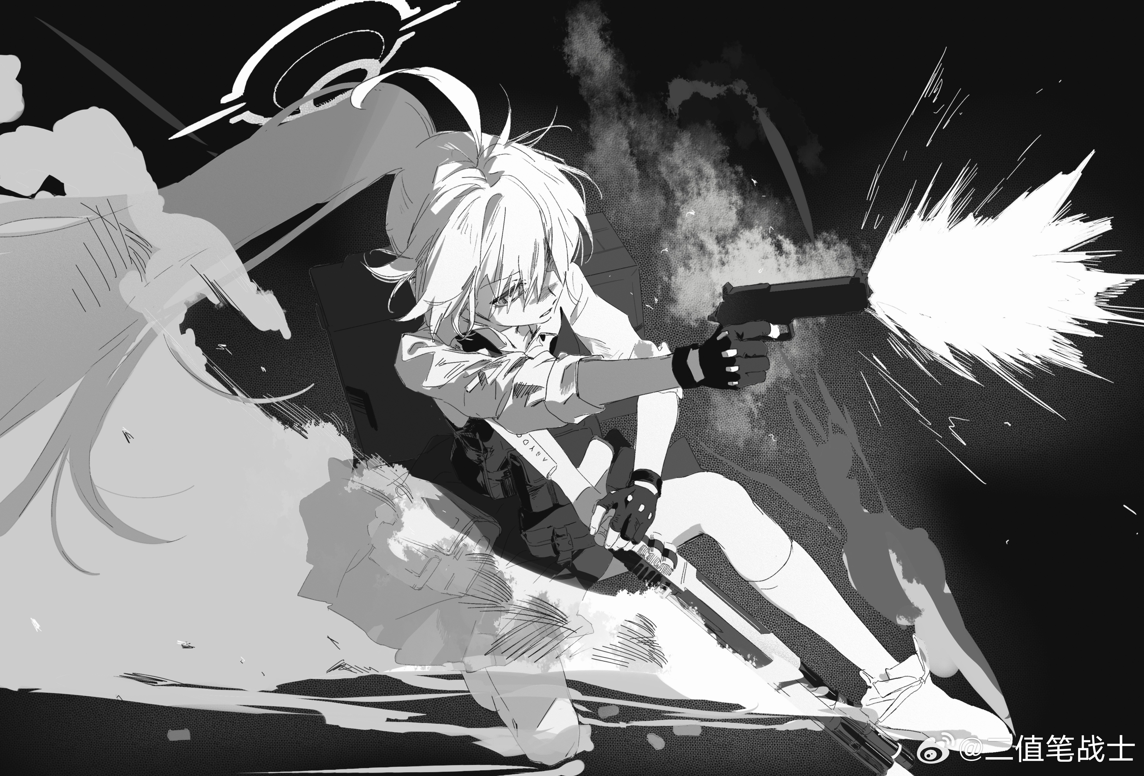 1girl absurdres ahoge artist_name blue_archive fingerless_gloves firing full_body gloves gun hair_between_eyes halo highres holding holding_gun holding_weapon hoshino_(armed)_(blue_archive) hoshino_(blue_archive) looking_ahead monochrome parted_lips ponytail sidelocks sleeves_rolled_up solo watermark weapon weibo_watermark yu-y_(824412)