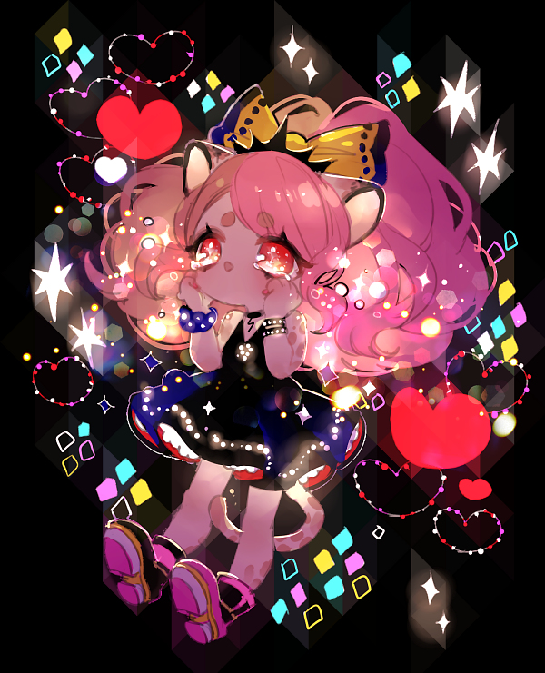 1girl animal_ears bare_shoulders black_background black_dress boots bow bracelet citti_(show_by_rock!!) colored_skin dress full_body hair_bow hands_on_own_cheeks hands_on_own_face heart jewelry leopard_ears leopard_girl leopard_tail mamaloni medium_hair no_mouth pink_boots pink_hair pink_skin red_eyes show_by_rock!! sleeveless sleeveless_dress solo sparkle sparkling_eyes swept_bangs tail tears tiara