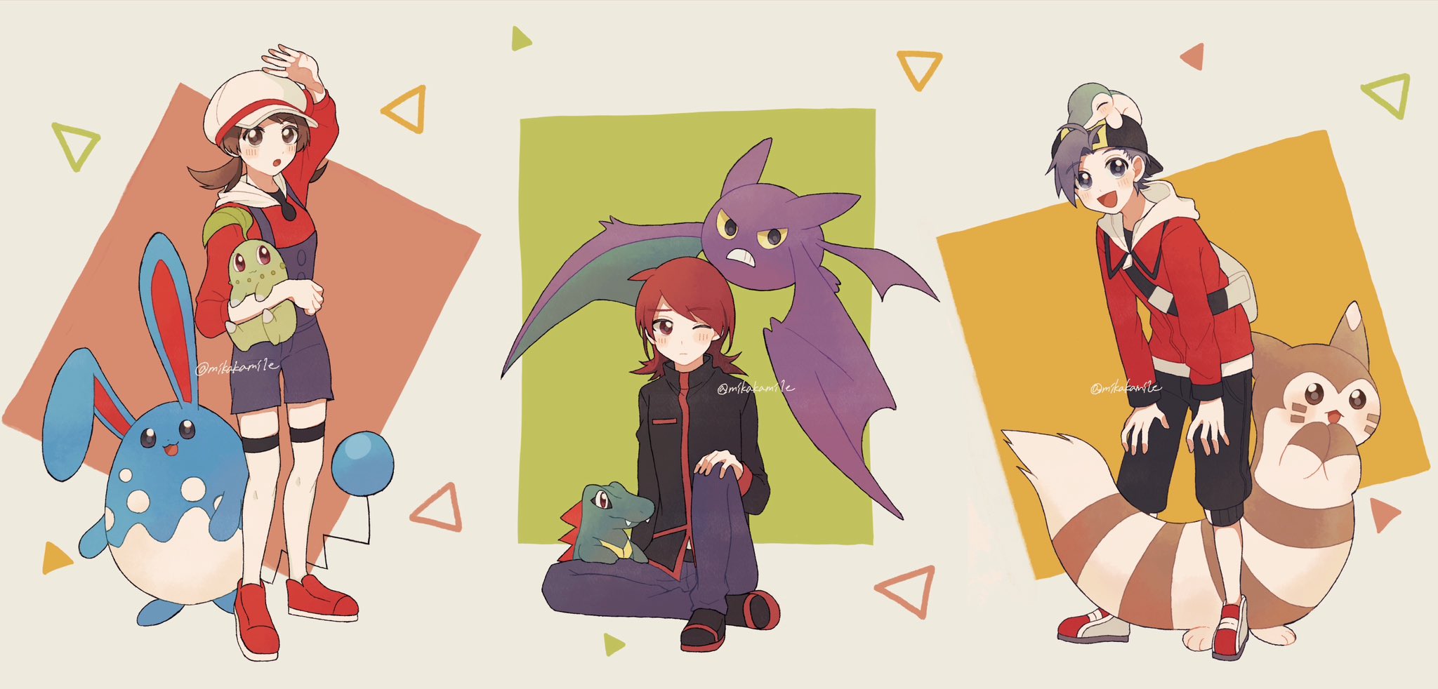 1girl 2boys :d :o animal_ears arm_up azumarill backwards_hat bag baseball_cap black_hat black_jacket black_pants blue_overalls blush bow brown_hair newsboy_cap chikorita closed_mouth crobat cyndaquil ethan_(pokemon) furret gen_2_pokemon grey_eyes grey_hair hand_on_own_knee hat hat_bow highres holding holding_pokemon hood hooded_jacket jacket knee_up leaning_forward long_sleeves lyra_(pokemon) medium_hair mikakami1e multiple_boys nintendo on_head one_eye_closed open_mouth overalls pants pokemon pokemon_(creature) pokemon_heartgold_and_soulsilver pokemon_on_head rabbit red_bow red_footwear red_hair red_jacket red_ribbon red_shirt ribbon shirt shoes short_hair silver_(pokemon) smile tail thighhighs totodile turtleneck turtleneck_jacket twintails white_bag white_hat white_thighhighs