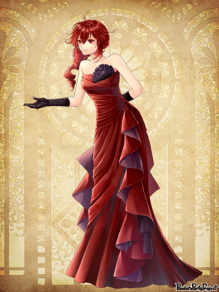 1girl arm_behind_back black_gloves breasts copyright_name dress full_body gloves long_hair neko2noko outstretched_hand pandora_party_project red_dress red_eyes sleeveless sleeveless_dress small_breasts smile solo yellow_background