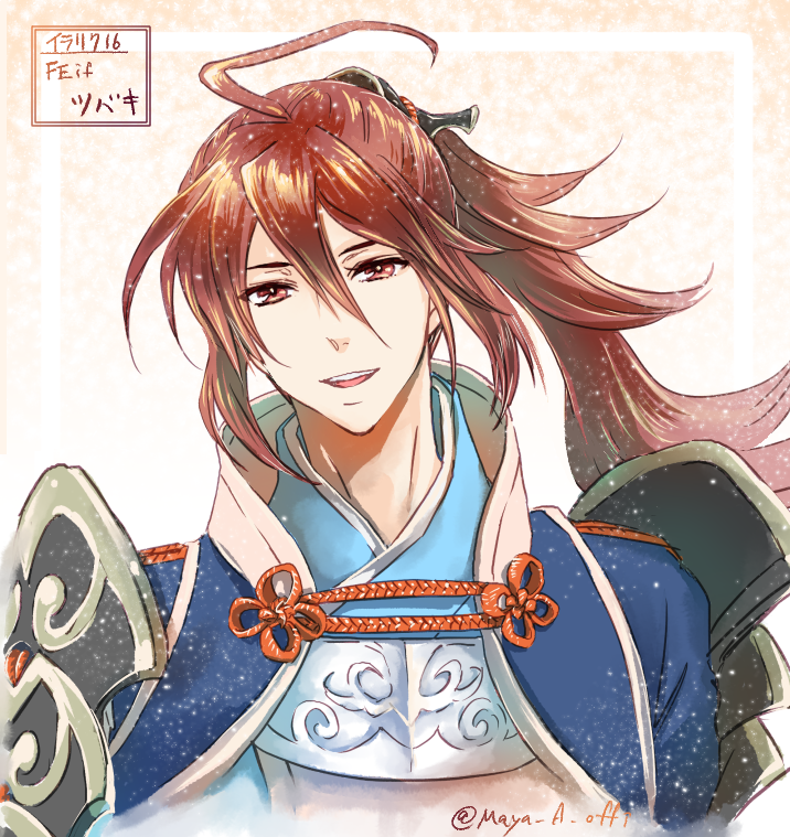 1boy ahoge armor fire_emblem fire_emblem_fates hair_between_eyes high_ponytail japanese_armor japanese_clothes long_hair male_focus maya_a_offi messy_hair nintendo ponytail red_eyes red_hair sidelocks subaki_(fire_emblem)