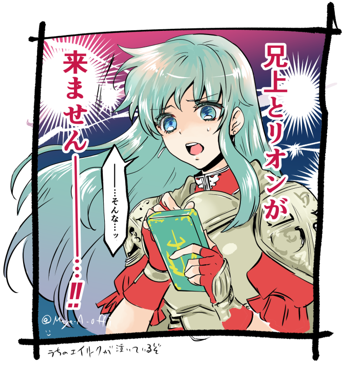 1girl aqua_eyes aqua_hair armor blue_eyes breastplate cape cellphone earrings eirika_(fire_emblem) fingerless_gloves fire_emblem fire_emblem:_the_sacred_stones gloves jewelry long_hair maya_a_offi nintendo open_mouth phone red_gloves sidelocks smartphone solo translation_request