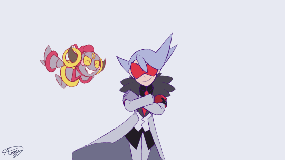 1boy animated animated_gif crossed_arms floating gen_6_pokemon gloves grey_background grey_gloves grey_hair hoopa horns kththeartist lear_(pokemon) legendary_pokemon looking_at_viewer male_focus mythical_pokemon nintendo pokemon pokemon_(creature) pokemon_masters_ex red-tinted_eyewear signature simple_background smile standing tinted_eyewear