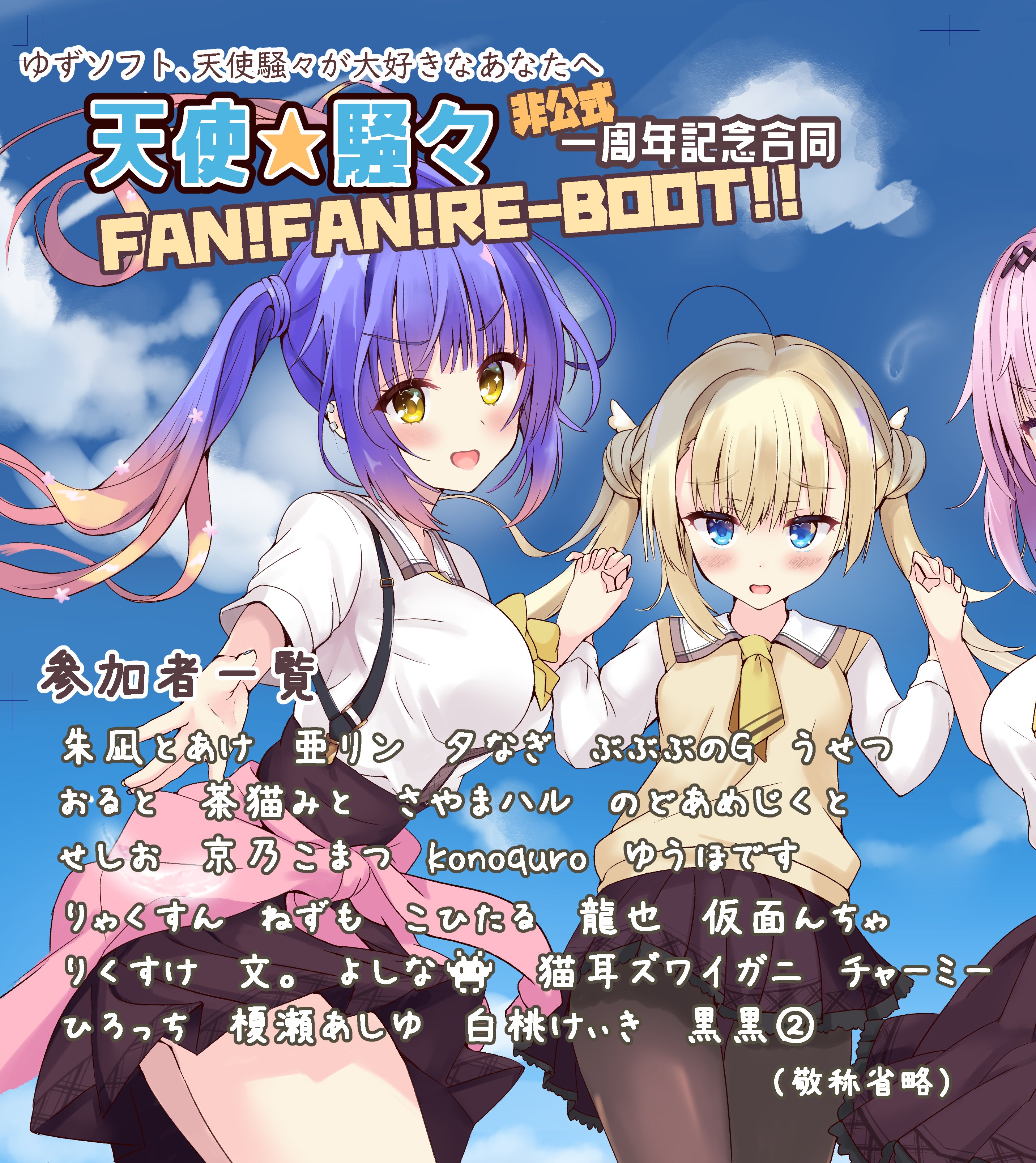 3girls :d \||/ absurdres ahoge black_pantyhose blonde_hair blue_eyes blue_hair blue_sky blush bow breasts brown_skirt clothes_around_waist commentary_request copyright_name cowboy_shot day double_bun ear_piercing eyelashes eyes_visible_through_hair floating_hair flower gradient_hair gyaru hair_between_eyes hair_bun hair_flower hair_ornament hand_up happy high-waist_skirt highres holding_hands interlocked_fingers kogal kohibari_kurumi large_breasts long_sleeves looking_at_viewer medium_hair multicolored_hair multiple_girls necktie open_mouth outdoors outstretched_arm pantyhose piercing pink_flower pink_hair pleated_skirt purunyara scene_reference school_uniform shirayuki_noa shirt shy sidelocks simple_background skirt sky sleeves_rolled_up small_breasts smile sparkling_eyes suspender_skirt suspenders sweater_vest tanikaze_amane tenshi_souzou_re-boot! translation_request tsurime twintails v-shaped_eyebrows white_shirt wing_hair_ornament yellow_bow yellow_eyes yellow_necktie yellow_sweater_vest