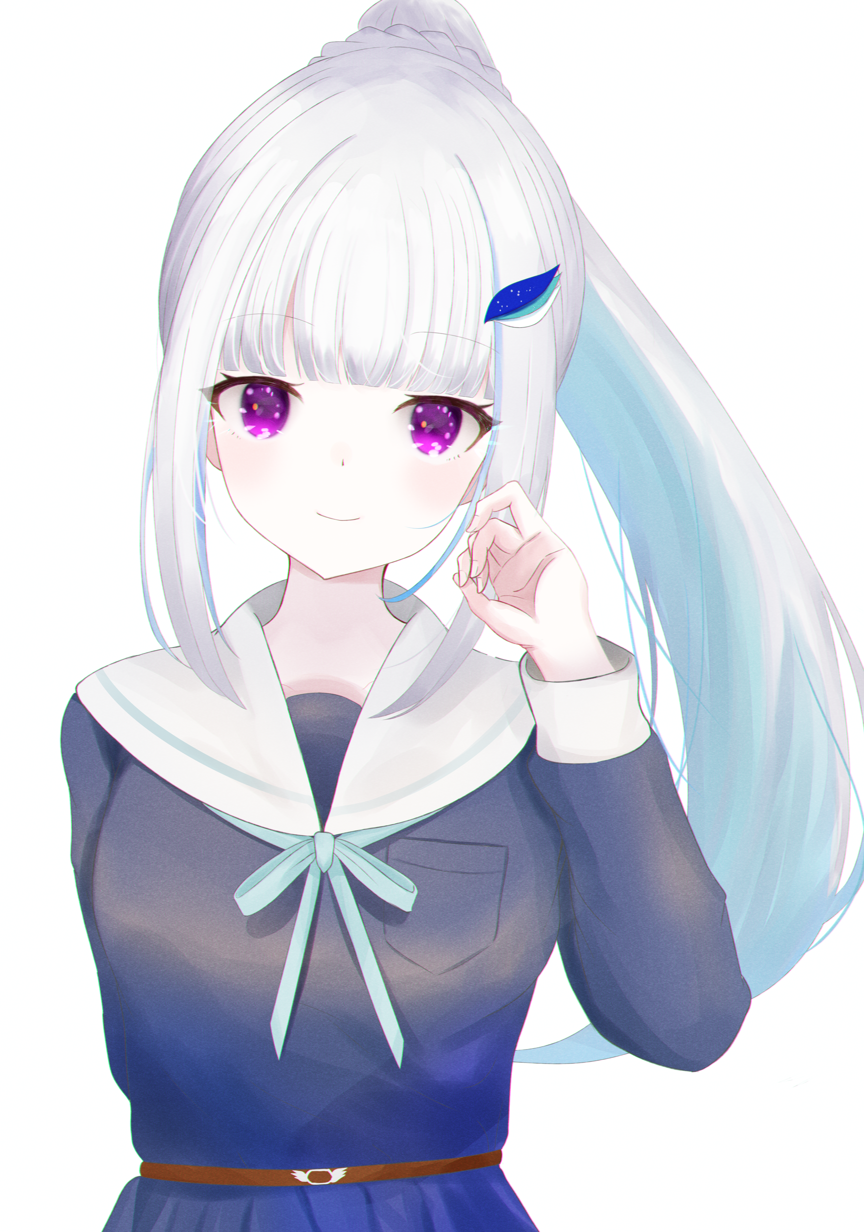 1girl absurdres aqua_hair aqua_ribbon belt blue_dress blue_hair blunt_bangs blush bow braid breast_pocket brown_belt closed_mouth dress eyelashes hair_ornament hand_up hechi_z high_ponytail highres lize_helesta lize_helesta_(4th_costume) long_hair long_sleeves looking_at_viewer multicolored_hair neck_ribbon nijisanji official_alternate_costume pleated_dress pocket ponytail ponytail_with_braided_base purple_eyes ribbon sailor_collar sailor_dress school_uniform sidelocks simple_background smile solo source_request streaked_hair third-party_source virtual_youtuber white_background white_hair white_sailor_collar