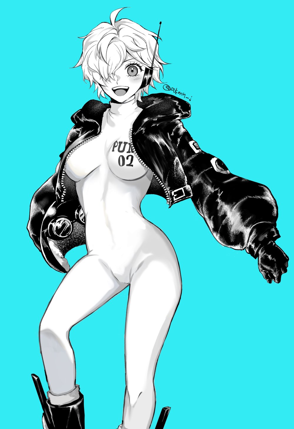 1girl akmn artist_name black_gloves blush bodysuit commentary_request earpiece gloves greyscale_with_colored_background hair_over_one_eye helmet highres holding holding_unworn_helmet jacket leather leather_jacket long_sleeves looking_at_viewer monochrome one_eye_covered one_piece open_clothes open_jacket open_mouth short_hair simple_background smile solo teeth twitter_username unworn_helmet vegapunk_lilith