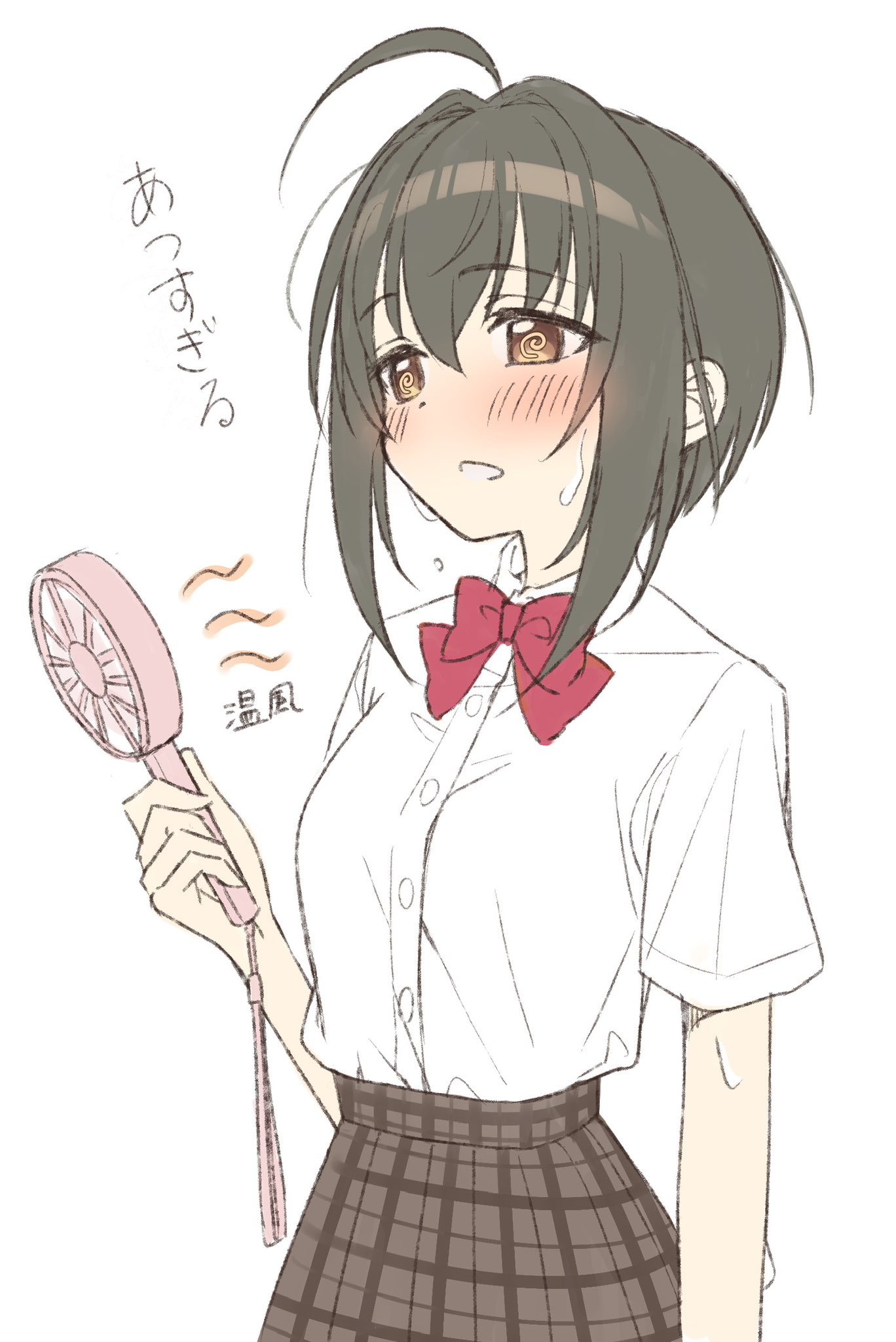 1girl @_@ ahoge black_hair blush bow bowtie brown_skirt commentary_request electric_fan hand_fan hibiki_tohru highres holding holding_fan hot idolmaster idolmaster_cinderella_girls kohinata_miho looking_ahead plaid_clothes plaid_skirt red_bow red_bowtie school_uniform shirt shirt_tucked_in short_hair short_sleeves simple_background skirt solo sweat translated white_background white_shirt