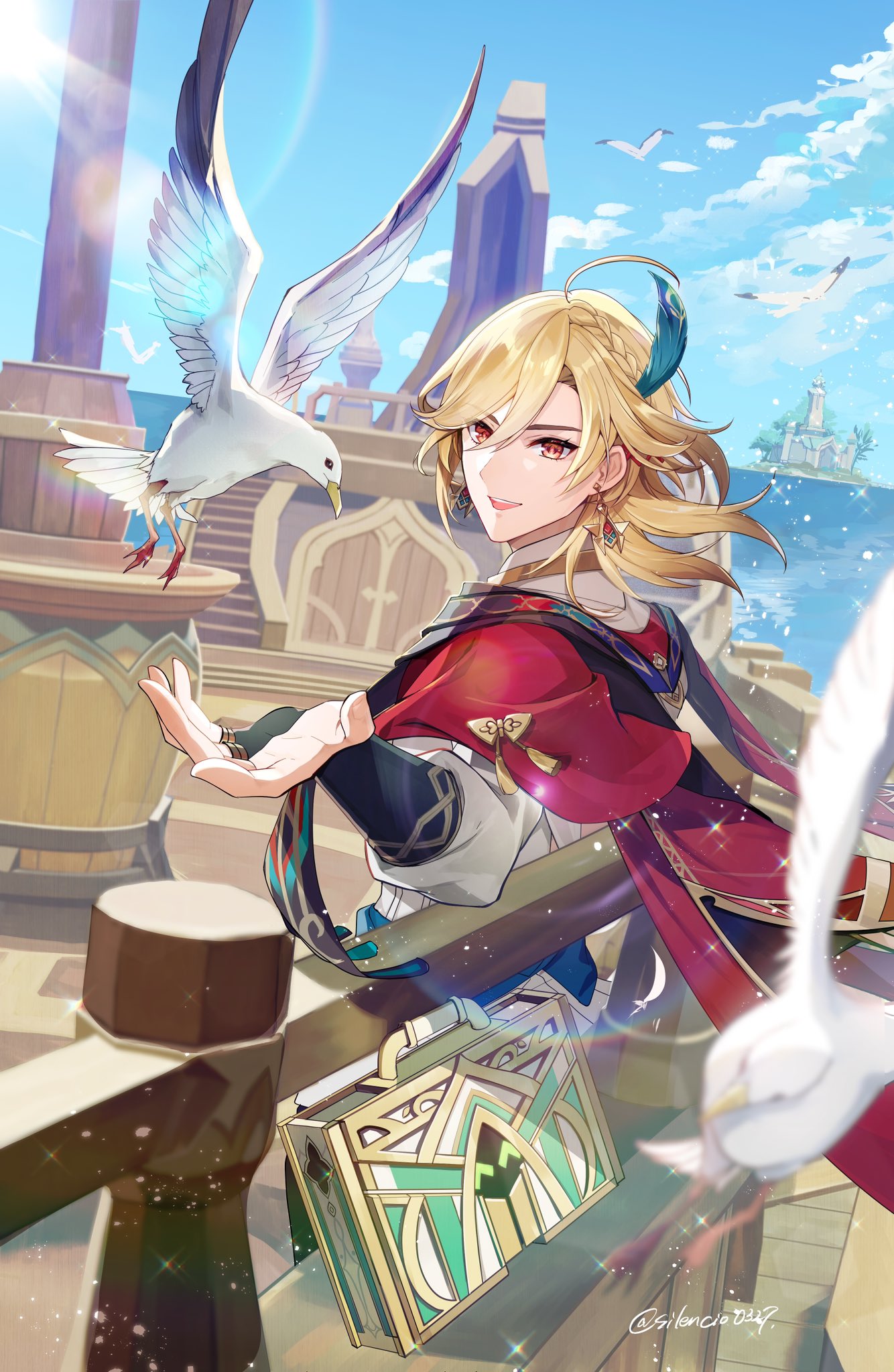 1boy :d ^_^ ahoge artist_name bird black_gloves blonde_hair blue_sash blue_sky boat braid building cape closed_eyes cloud day earrings feather_hair_ornament feathers fingerless_gloves flying genshin_impact gloves gold_trim hair_between_eyes hair_ornament hashtag-only_commentary highres island jewelry kaveh_(genshin_impact) lens_flare light_particles long_hair long_sleeves looking_at_viewer looking_to_the_side male_focus mehrak_(genshin_impact) middle_eastern_architecture muri_(pan'ichi_murimuri_geinin) open_mouth outdoors outstretched_arm outstretched_hand parted_bangs railing red_cape red_eyes sash seagull shirt single_braid sky smile solo sparkle stairs suitcase sun sunlight tassel teeth twitter_username upper_teeth_only watercraft white_shirt wooden_railing
