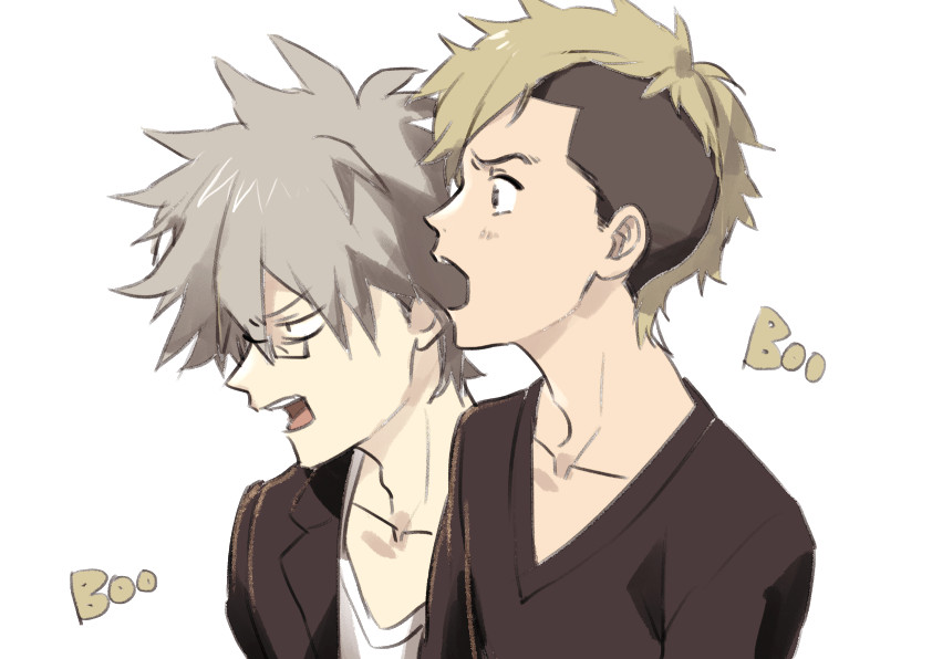 2boys black_jacket black_shirt blonde_hair collarbone glasses grey_hair hiraoka_daisuke jacket long_sleeves male_focus multiple_boys open_mouth sansintei_auto shirobako shirt short_hair simple_background takanashi_tarou upper_body white_background