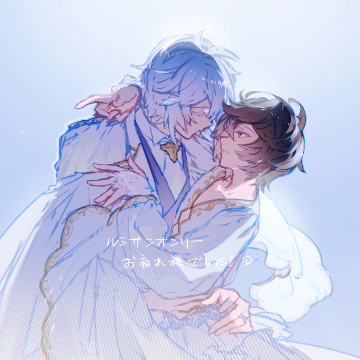 2boys ahoge arm_around_neck brooch brown_hair closed_eyes colored_eyelashes commentary_request crossdressing crossdressing_(mtf) gloves granblue_fantasy hair_between_eyes highres jewelry light_smile lucifer_(shingeki_no_bahamut) male_focus messy_hair multiple_boys partially_fingerless_gloves red_eyes ring ruby_maliilm sandalphon_(granblue_fantasy) simple_background upper_body white_hair yaoi