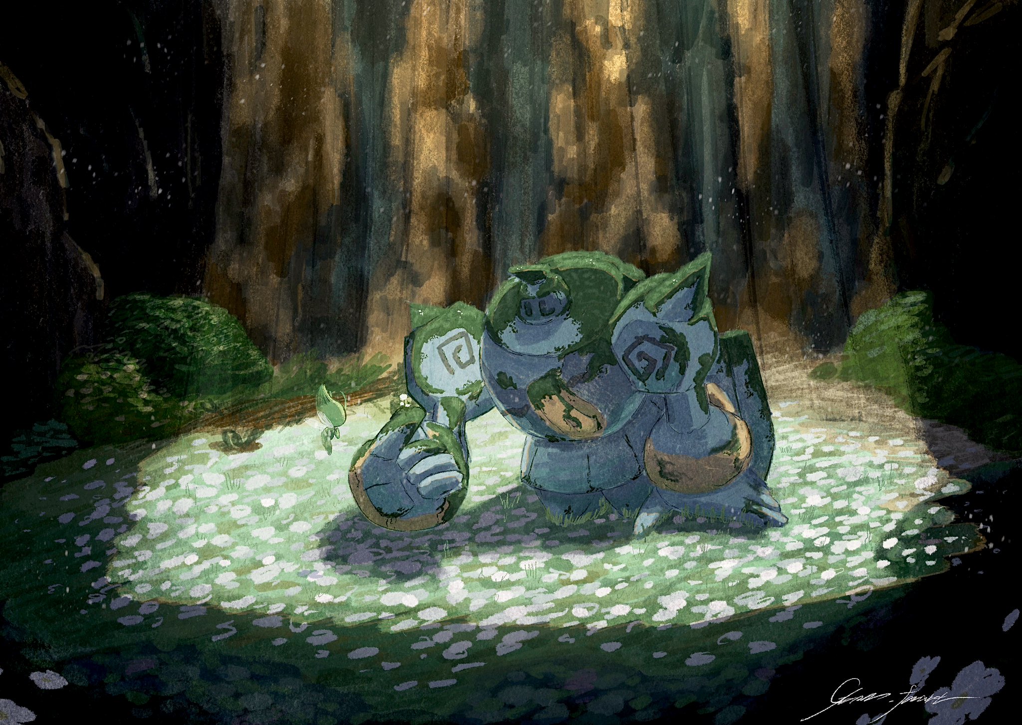 all_fours blank_eyes bush celebi fairy_wings field floating flower flower_field forest gen_2_pokemon gen_5_pokemon golem golurk grass gyura highres holding holding_flower kneeling legendary_pokemon light_rays moss mythical_pokemon nature nintendo no_humans on_ground pokemon pokemon_(creature) pokemon_focus shoulder_spikes spikes spotlight swirl tree wings