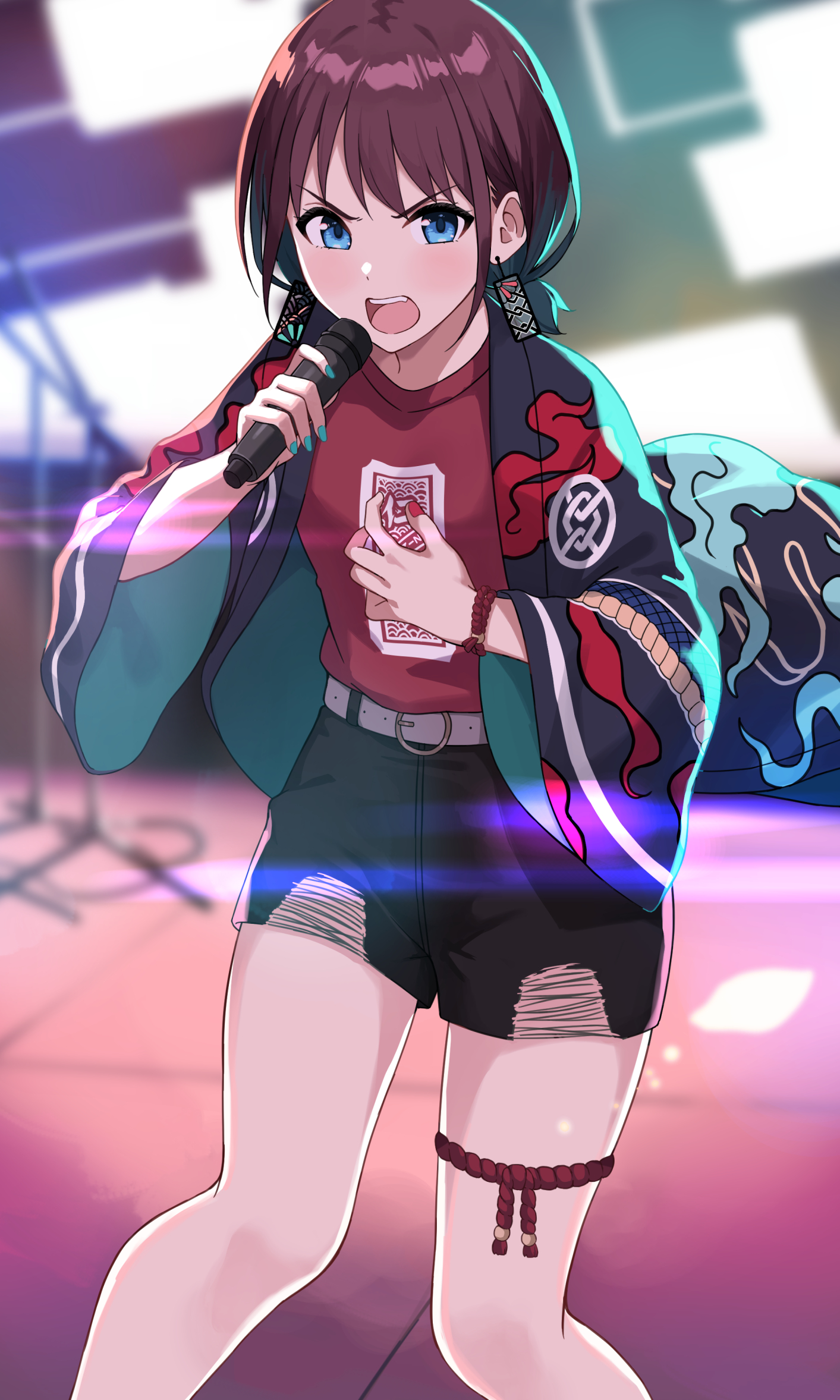 1girl belt belt_buckle black_shorts blue_eyes blue_hair blue_happi blue_nails blurry blurry_background blush bracelet buckle commentary_request earrings fuyutuji girls_band_cry gradient_hair highres holding holding_microphone iseri_nina jewelry kuuhaku_to_catharsis leg_ribbon lens_flare long_sleeves low_twintails microphone microphone_stand multicolored_hair multicolored_nails nail_polish open_happi open_mouth red_nails red_ribbon red_shirt ribbon shirt short_hair short_twintails shorts solo teeth thigh_ribbon twintails upper_teeth_only white_belt
