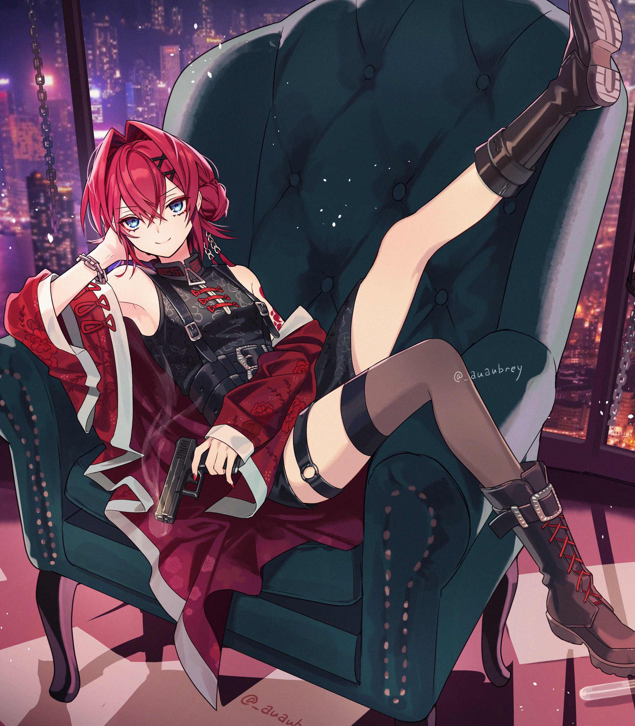 absurdres ange_katrina ange_katrina_(china_dress) arm_tattoo armchair armpits asymmetrical_legwear aubrey_(kyarairo) belt belt_boots black_dress black_shorts blue_eyes boots breasts chain chain_bracelet chair china_dress chinese_clothes cityscape cross-laced_footwear crossed_bangs dress eyeshadow gun hair_bun hair_intakes hair_ornament handgun head_on_hand high_collar highres indoors jacket knees leaning_back leg_up looking_at_viewer makeup multiple_belts night nijisanji off_shoulder paisley red_eyeshadow red_hair red_jacket red_nails shorts sitting_sideways small_breasts smile smoke smoking_barrel tassel tassel_hair_ornament tattoo thigh_strap thighhighs thighs virtual_youtuber watermark weapon wide_sleeves window x_hair_ornament