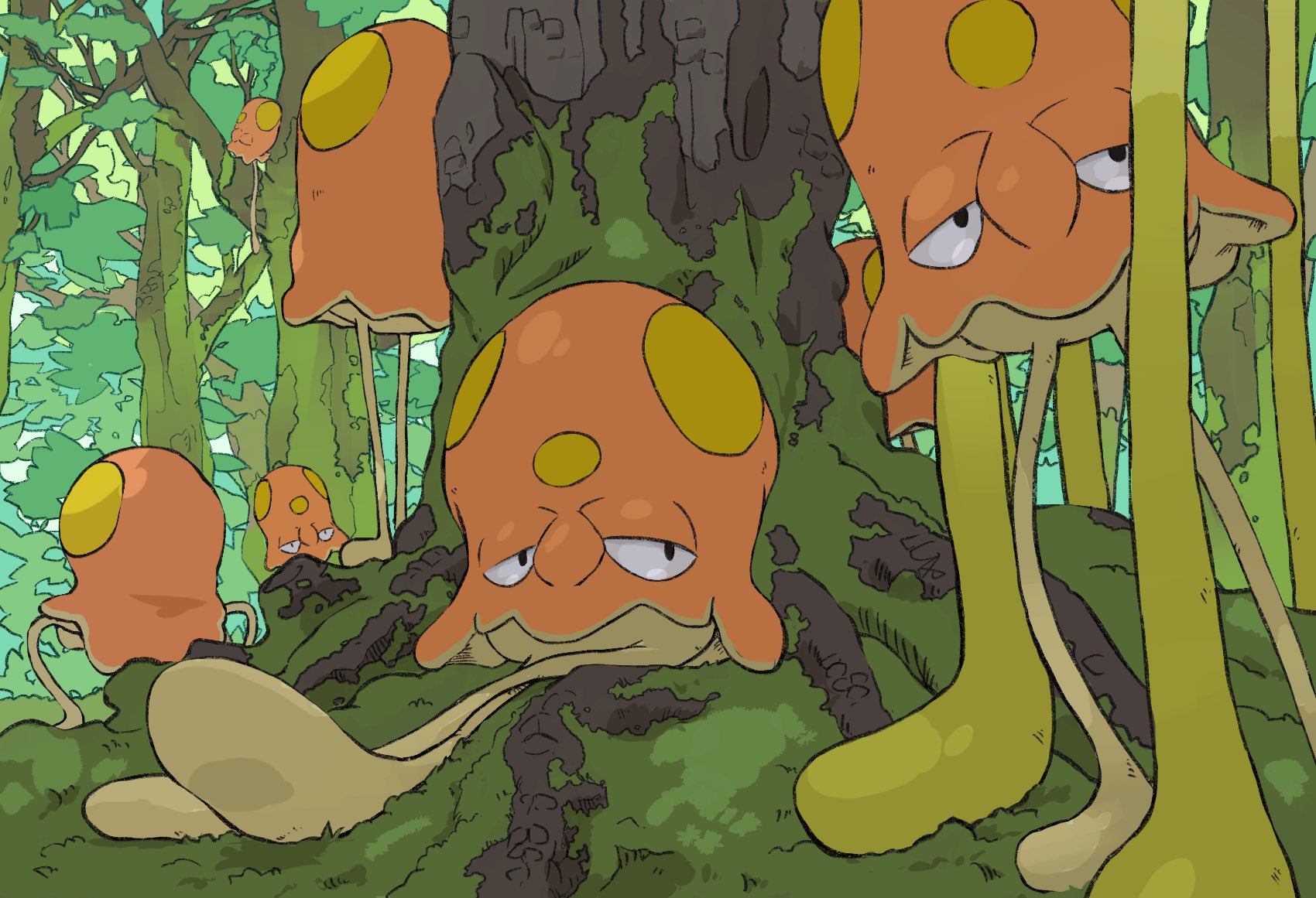 aomon_(yuuji7604) colored_skin day forest highres moss multicolored_skin nature nintendo no_humans orange_skin outdoors pokemon pokemon_(creature) sitting standing toedscool tree two-tone_skin yellow_skin