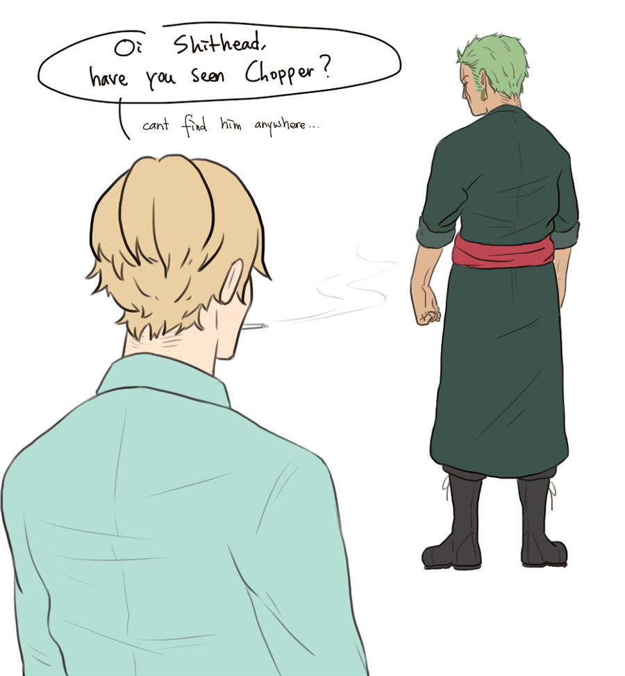 2boys back blonde_hair blue_shirt boots cigarette commentary dressrouba earrings english_commentary english_text green_kimono japanese_clothes jewelry kimono male_focus multiple_boys one_piece roronoa_zoro sanji_(one_piece) sash shirt short_hair sideburns smoke speech_bubble