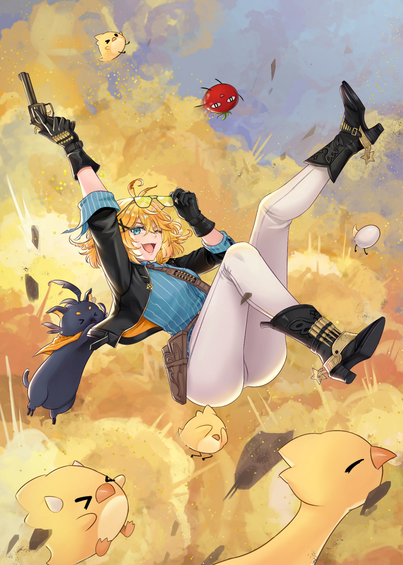 1girl ammunition animal aqua_shirt black_footwear black_jacket blonde_hair blue_eyes cartridge dinokano doki_amber_doge_(dokibird) dokibird dokibird_(bounty_hunter) dokibird_(tomato) dragoon_(dokibird) egg explosion eyewear_on_head full_body gun handgun handgun_cartridge highres holding holding_weapon holster indie_virtual_youtuber jacket medium_hair one_eye_closed open_clothes open_jacket open_mouth pants revolver rifle_cartridge shirt smile solo spurs sunglasses virtual_youtuber weapon white_pants
