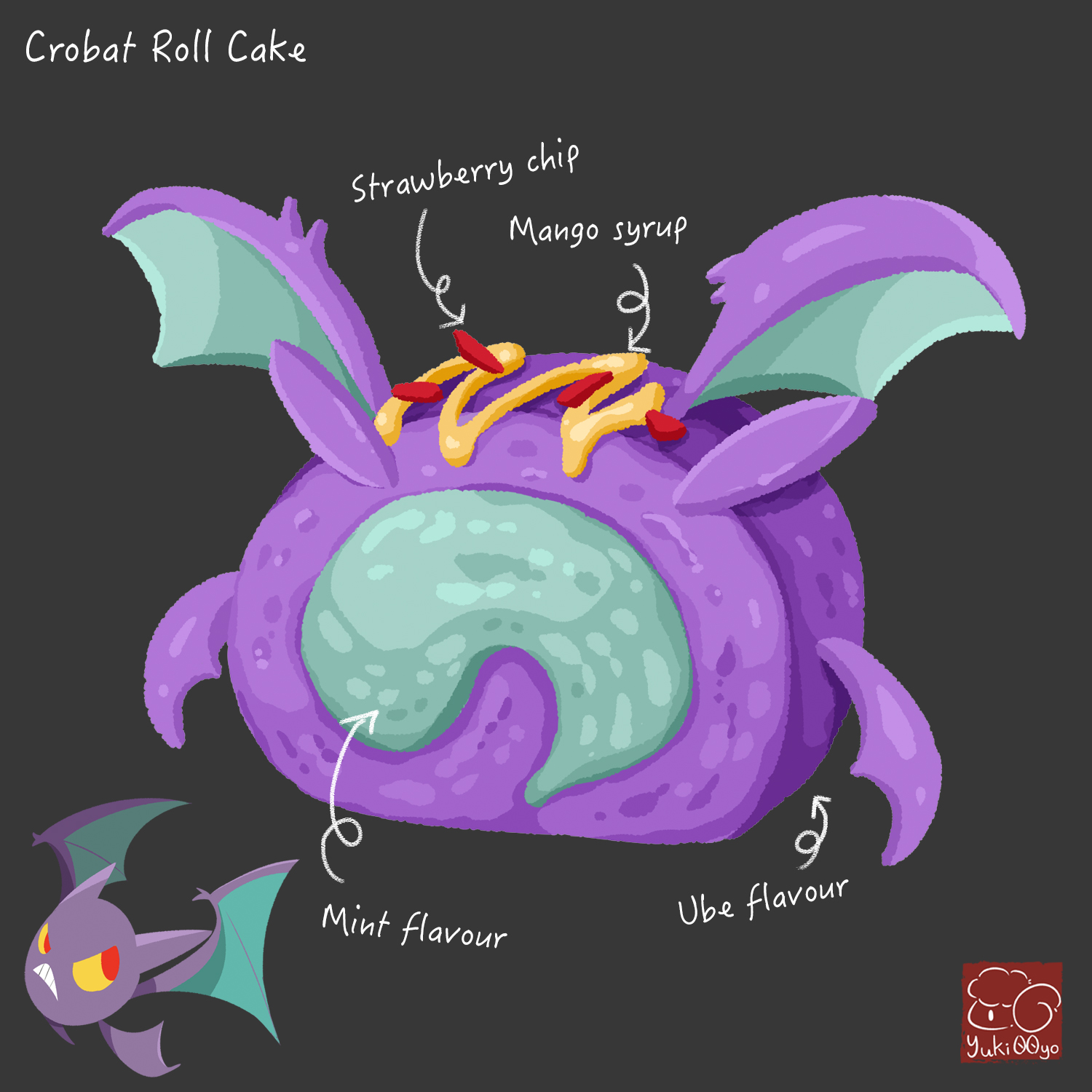 artist_logo artist_name cake character-themed_food character_name cream crobat english_text food food_focus food_name gen_2_pokemon grey_background highres logo nintendo no_humans pokemon pokemon_(creature) simple_background swiss_roll syrup yuki00yo
