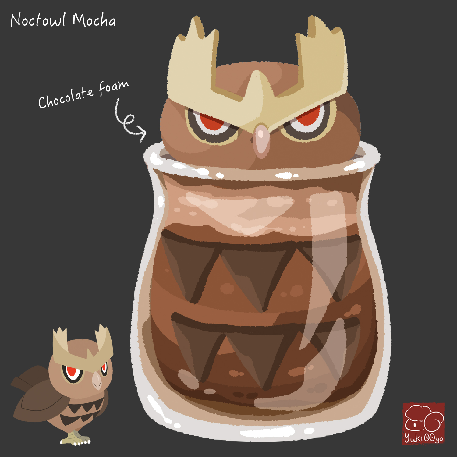 artist_logo artist_name character-themed_food character_name coffee cup drink drinking_glass foam food food_focus food_name gen_2_pokemon grey_background highres logo nintendo no_humans noctowl pokemon pokemon_(creature) simple_background yuki00yo