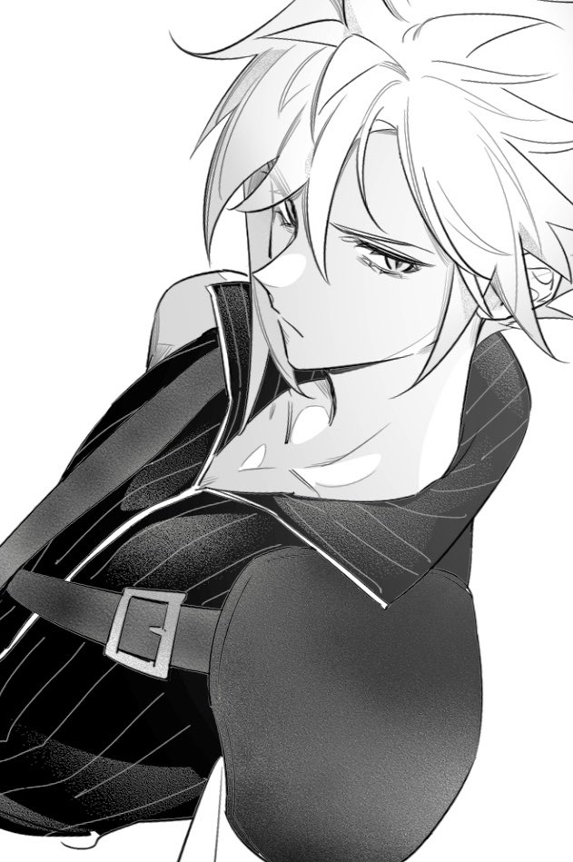 1boy armor black_vest chest_strap closed_mouth cloud_strife final_fantasy final_fantasy_vii final_fantasy_vii:_advent_children greyscale hair_between_eyes lily_(shio1006) looking_at_viewer male_focus monochrome popped_collar short_hair shoulder_armor single_bare_shoulder single_shoulder_pad solo spiked_hair upper_body vest white_background