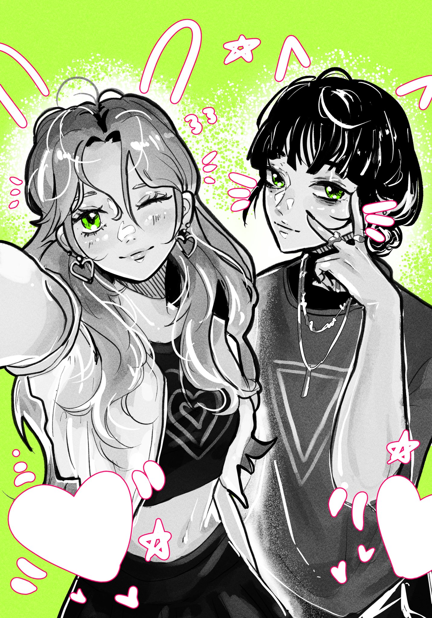 2girls arm_up blush commentary crop_top cropped_jacket drawn_ears drawn_whiskers earrings english_commentary green_background green_eyes heart heart_earrings highres jewelry kininatteru_hito_ga_otoko_ja_nakatta koga_mitsuki long_hair looking_at_viewer midriff multiple_girls navel necklace one_eye_closed oosawa_aya partially_colored purikura selfie short_hair short_sleeves smile upper_body v v_over_eye wavy_hair xiaopastry