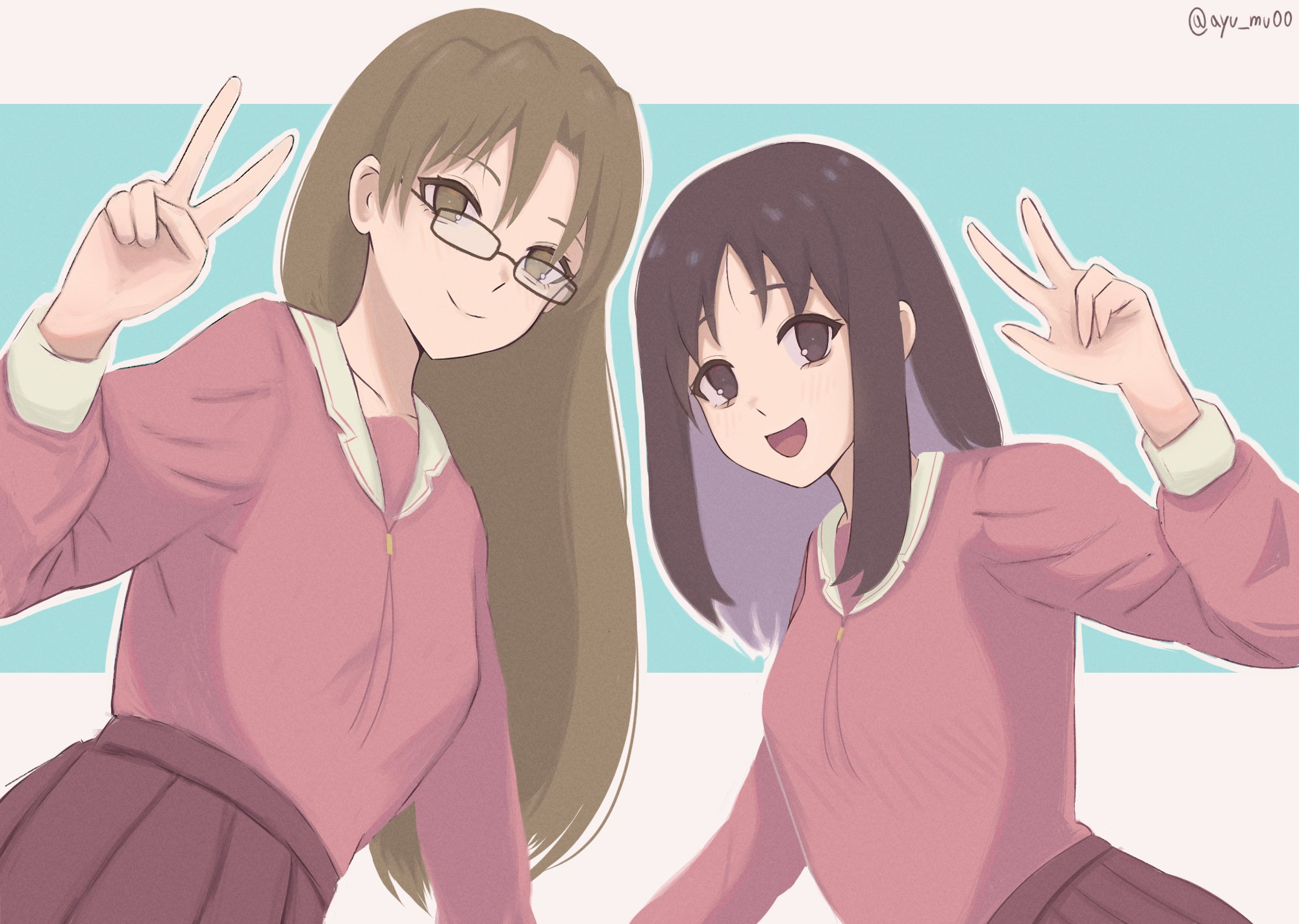 2girls ayu_mu00 azumanga_daioh's_school_uniform azumanga_daiou brown_eyes brown_hair glasses highres kasuga_ayumu long_hair long_sleeves looking_at_viewer mizuhara_koyomi multiple_girls open_mouth pink_shirt pink_skirt pleated_skirt sailor_collar school_uniform shirt simple_background skirt smile twitter_username v white_sailor_collar