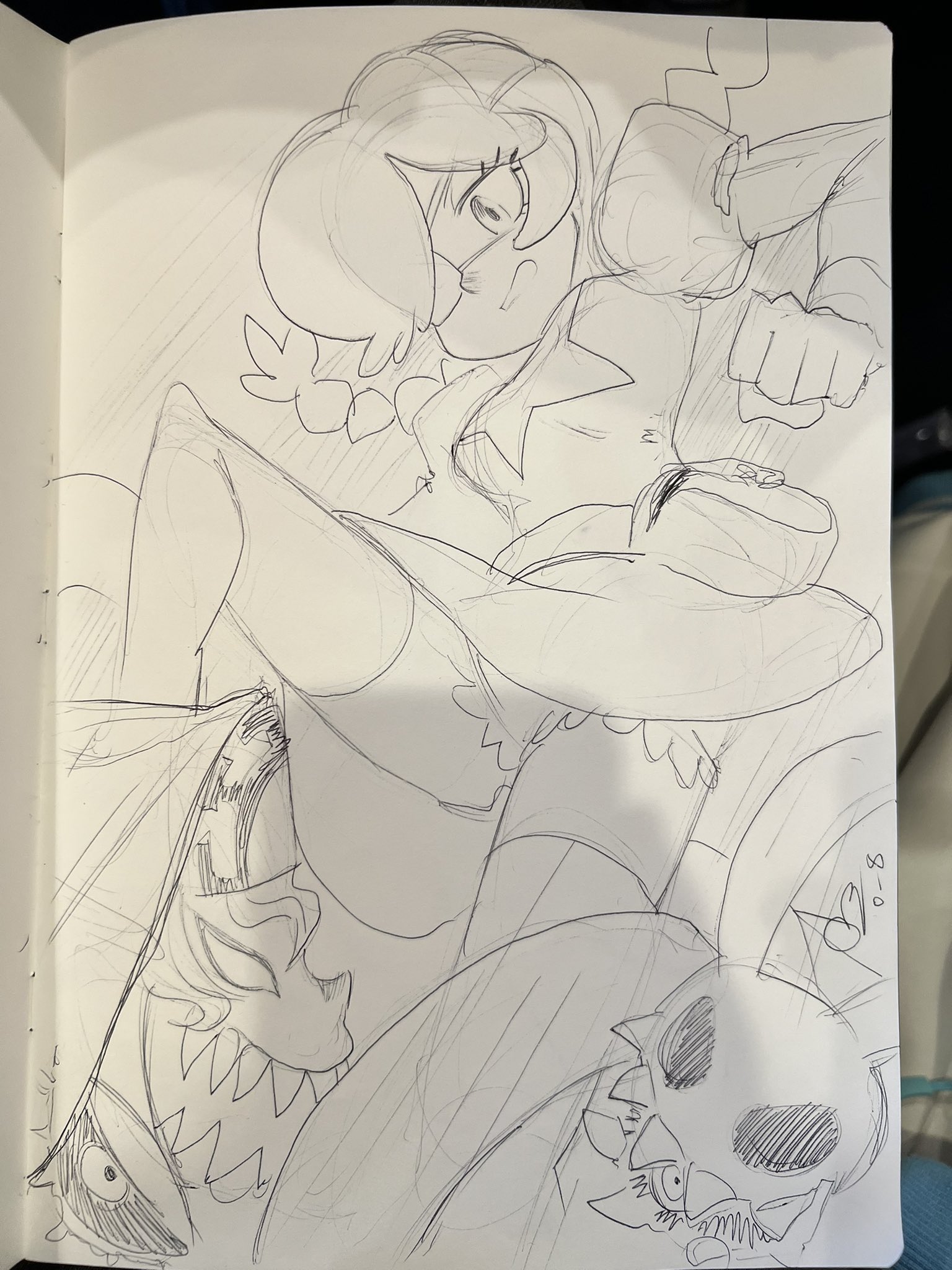 2girls alex_ahad annie_(skullgirls) belt_pouch bloomers braid double_(skullgirls) dress eyepatch fighting gift_art highres juliet_sleeves long_sleeves monster monster_girl multiple_girls nun open_mouth panties pen_(medium) photo_(medium) pouch puffy_sleeves sagan_(skullgirls) sharp_teeth short_dress sketch skullgirls teeth thighhighs traditional_media twin_braids underwear upskirt