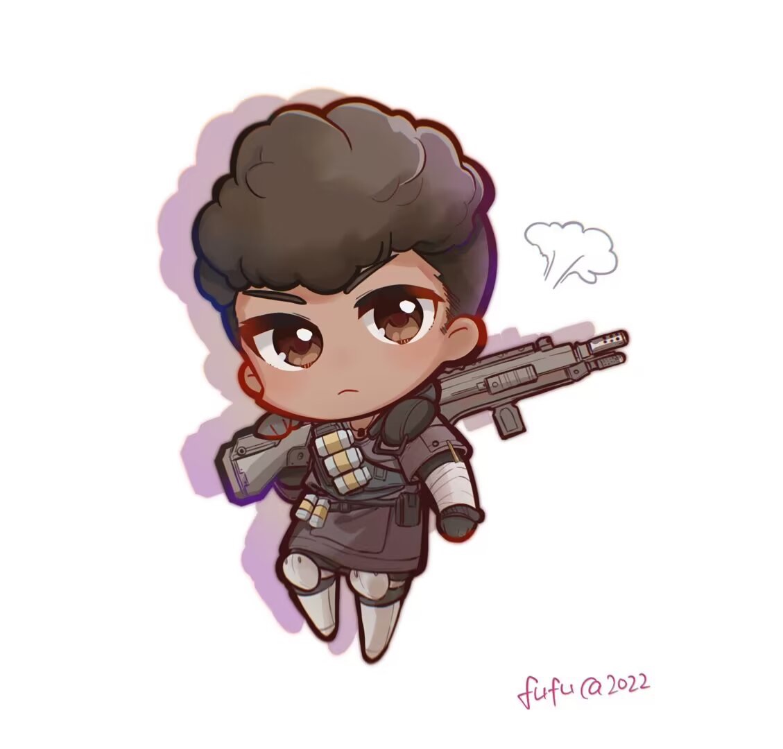 1girl animification apex_legends bangalore_(apex_legends) black_gloves boots brown_eyes brown_hair brown_jacket chibi chinese_commentary dark-skinned_female dark_skin drop_shadow frown g7_scout gloves grey_boots gun holding holding_gun holding_weapon jacket jianye knee_pads looking_at_viewer over_shoulder rifle short_hair solo v-shaped_eyebrows weapon weapon_over_shoulder