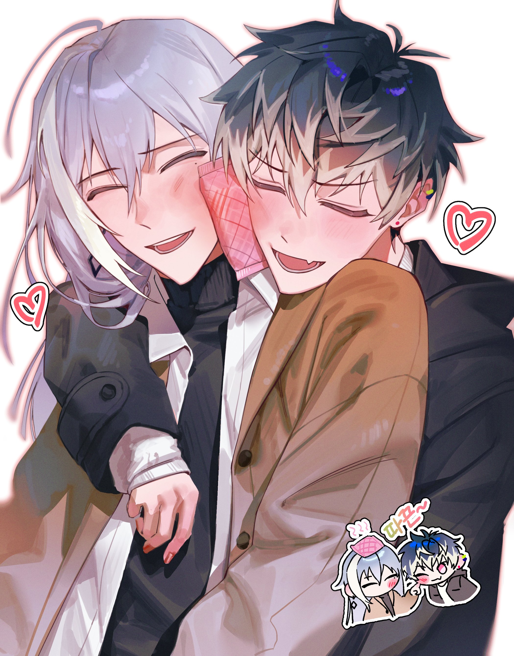 2boys absurdres black_hair black_jacket black_sweater blush blush_stickers brown_jacket closed_eyes collared_shirt commentary_request earclip fang grey_hair heart highres hood hood_down hooded_jacket idolish7 jacket kng_roo korean_commentary long_hair long_sleeves male_focus mole mole_under_eye momo_(idolish7) multicolored_hair multiple_boys one_eye_closed open_clothes open_jacket open_mouth open_shirt red_eyes shirt short_hair simple_background single_blush_sticker skin_fang smile streaked_hair sweater turtleneck turtleneck_sweater two-tone_hair white_background white_hair white_shirt white_sweater yaoi yuki_(idolish7)