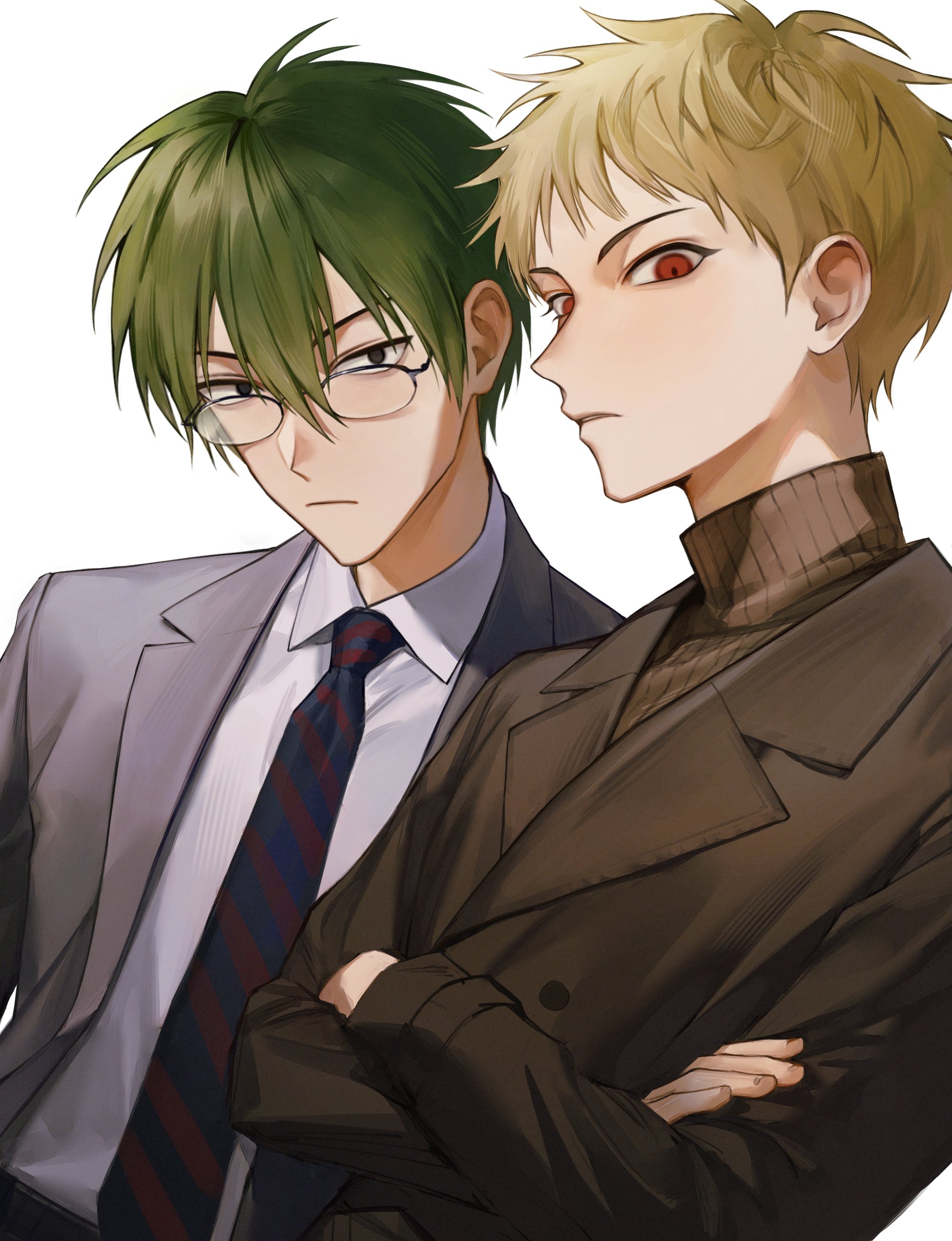 2boys absurdres atou_haruki black_eyes blonde_hair brown_jacket brown_sweater closed_mouth collared_shirt commentary_request crossed_arms frown green_hair grey_jacket hair_between_eyes highres jacket kng_roo korean_commentary long_sleeves male_focus multiple_boys necktie open_clothes open_jacket otowa_rui_(saibou_shinkyoku) red_eyes ribbed_sweater saibou_shinkyoku sanpaku shirt short_hair simple_background striped_clothes striped_necktie sweater turtleneck turtleneck_sweater upper_body white_background white_shirt