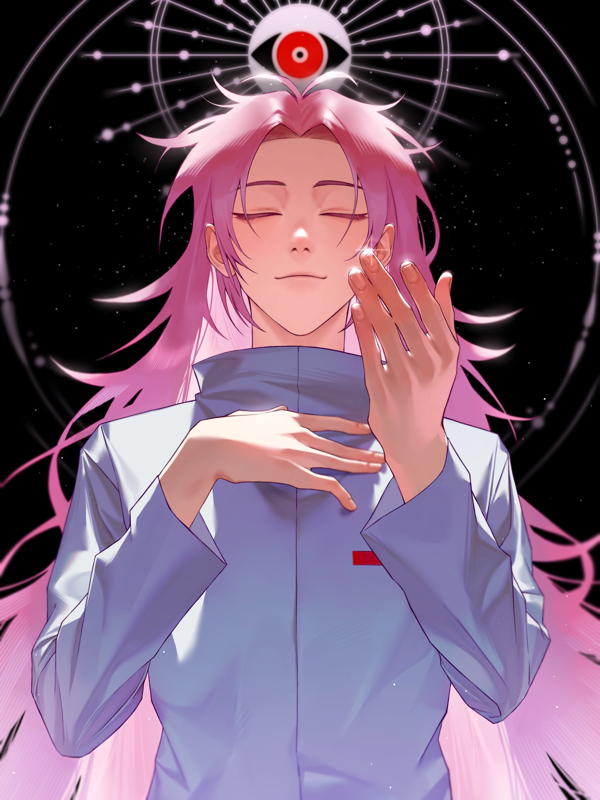 1boy absurdres antenna_hair closed_eyes closed_mouth commentary_request hand_on_own_chest hand_up hatsutori_hajime high_collar highres kng_roo korean_commentary light_particles long_hair long_sleeves male_focus parted_bangs pink_hair saibou_shinkyoku shirt smile solo white_shirt