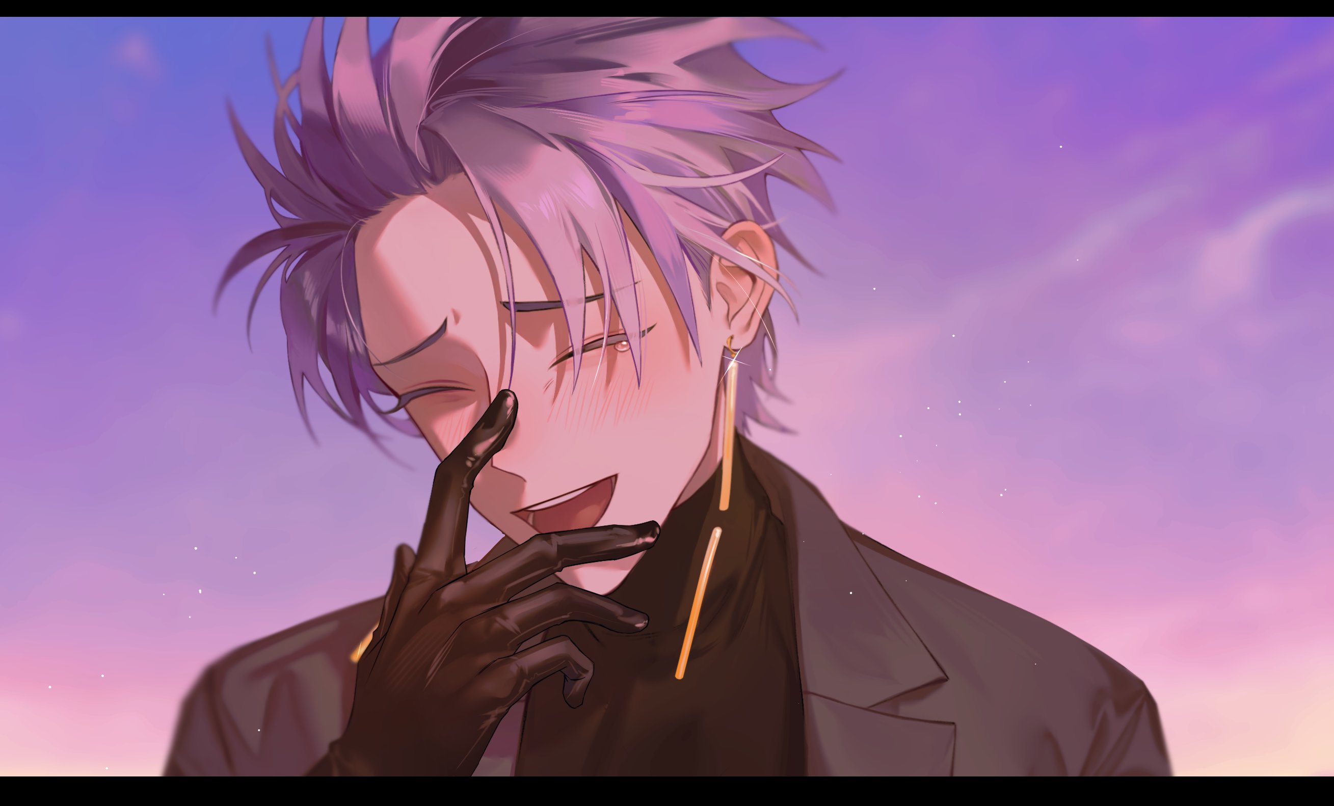 1boy black_gloves black_jacket black_sweater commentary_request earrings film_grain glint gloves highres jacket jewelry kng_roo korean_commentary leather leather_gloves letterboxed light_particles male_focus multicolored_hair open_clothes open_jacket open_mouth outdoors pink_hair purple_hair saibou_shinkyoku short_hair smile solo sweater tearing_up teeth theodore_riddle turtleneck turtleneck_sweater two-tone_hair upper_teeth_only