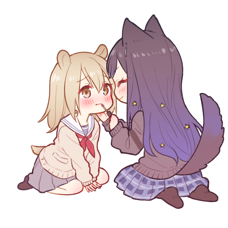 2girls animal_ears applying_makeup azusawa_kohane bear_ears bear_girl bear_tail beru_popooo black_hair black_socks blonde_hair blush brown_cardigan cardigan closed_eyes closed_mouth commentary_request dog_ears dog_girl dog_tail gradient_hair grey_skirt hair_ornament hand_on_another's_face holding_brush holding_makeup_brush kemonomimi_mode long_hair looking_at_another makeup_brush multicolored_hair multiple_girls neckerchief plaid_clothes plaid_skirt pleated_skirt project_sekai purple_hair red_neckerchief sailor_collar shiraishi_an simple_background skirt smile socks star_(symbol) star_hair_ornament tail white_background white_sailor_collar yellow_cardigan yuri