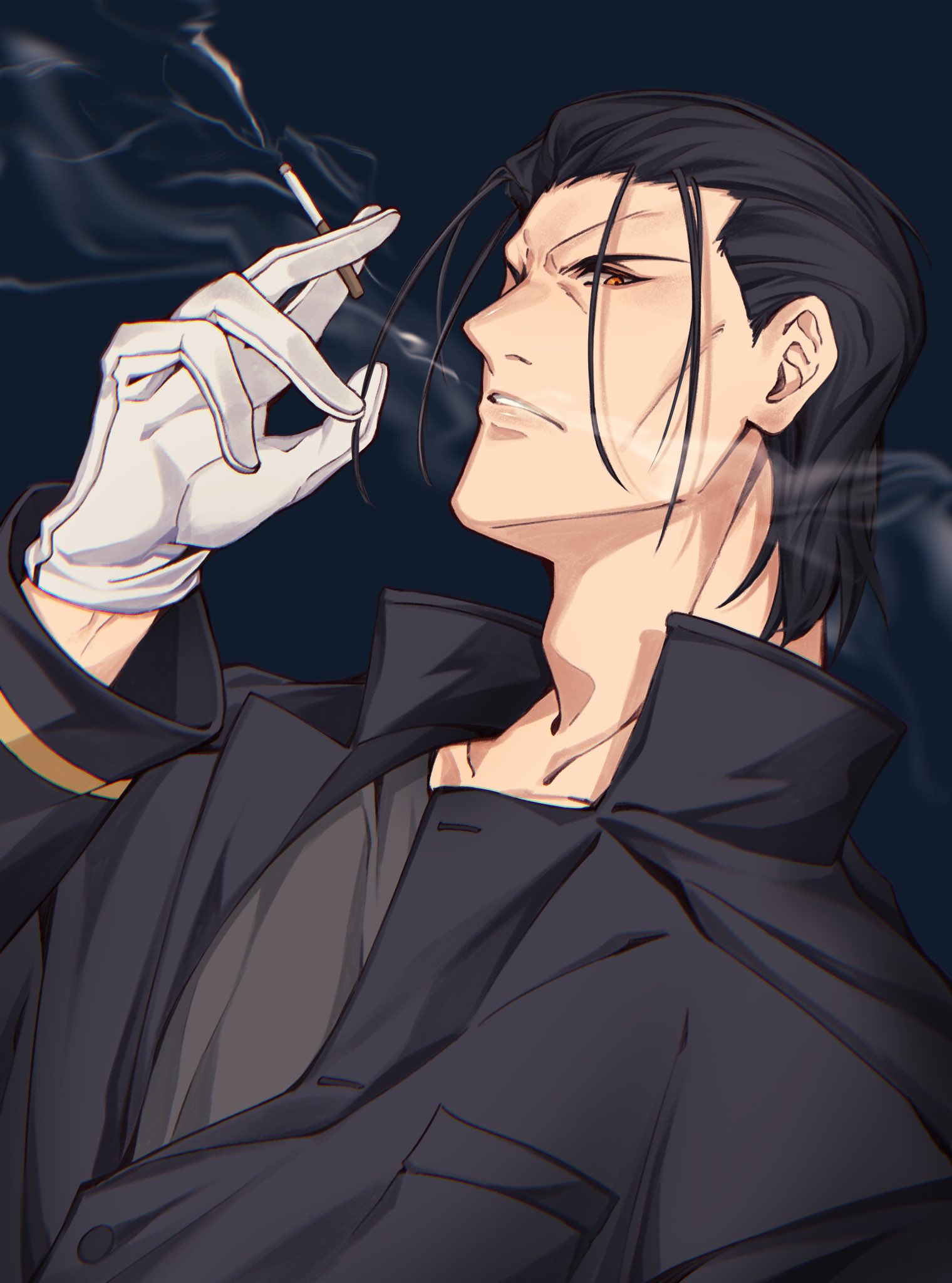 1boy black_background black_hair blue_jacket brown_eyes cigarette collarbone commentary_request gloves grey_shirt hair_slicked_back hand_up highres hizuchibunshin holding holding_cigarette jacket long_sleeves looking_at_viewer parted_lips popped_collar rurouni_kenshin saitou_hajime_(rurouni_kenshin) shirt short_hair smoking solo upper_body white_gloves
