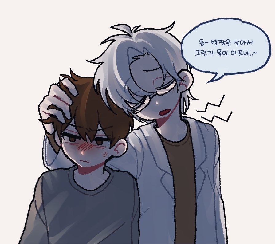 2boys anger_vein blush brown_eyes brown_footwear brown_hair chin_rest closed_eyes closed_mouth colored_eyelashes commentary_request glasses grey_shirt hair_between_eyes hand_on_another's_head head_on_head head_rest height_difference jabuchi_you jacket kanou_aogu korean_commentary korean_text male_focus multiple_boys nand9ng nose_blush open_clothes open_jacket open_mouth saibou_shinkyoku shirt simple_background white_background white_hair white_jacket